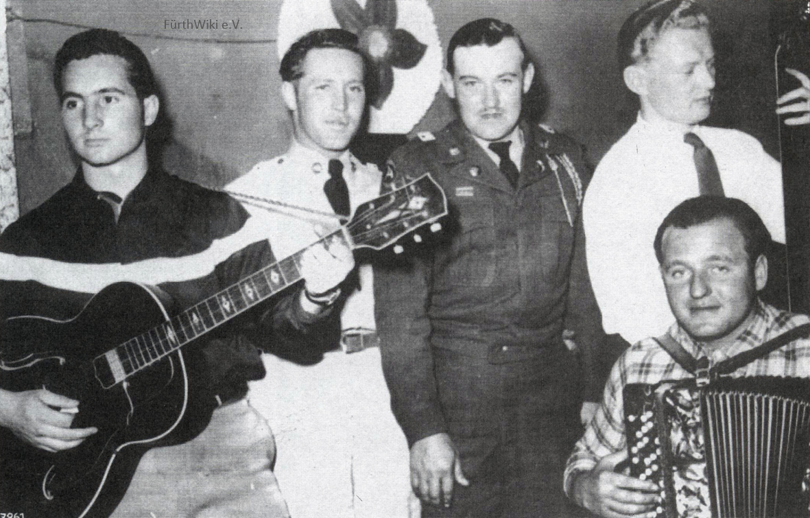 | Beschreibung | Freddy Quinn im Herbst 1950 bei einem Auftritt in der Bar im Gelben Löwen. Im Hintergrund rechts Rolf Ermann, darunter Kurt Reichel. Links: Freddy Quinn. In der Mitte zwei unbekannte US-Soldaten. | ||