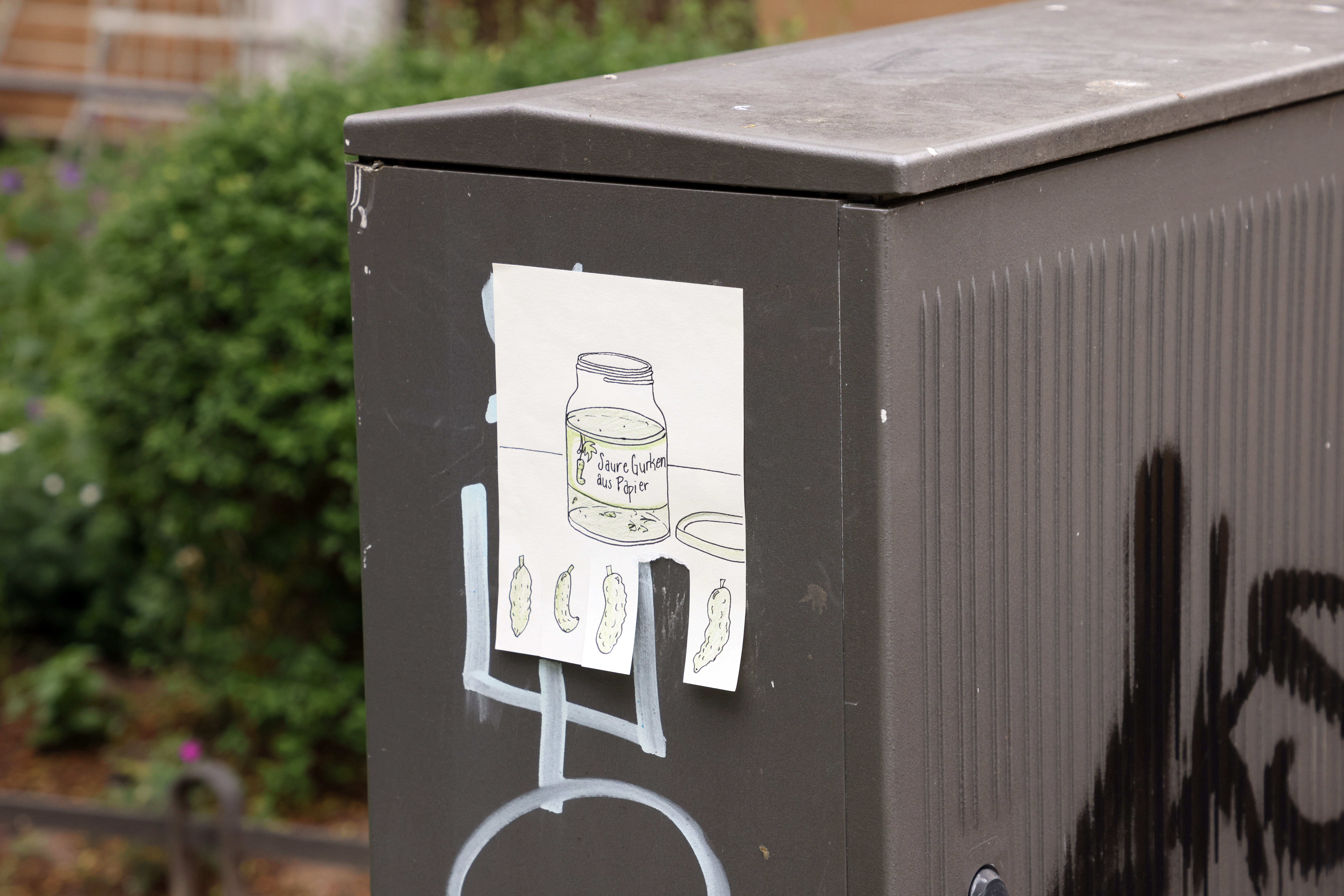 | Beschreibung | Frei Luft Galerie - Takeaway - Pommes und Saure Gurken aus Papier zum Abreißen von Anja Gmeinwieser, Mai 2022 | ||
