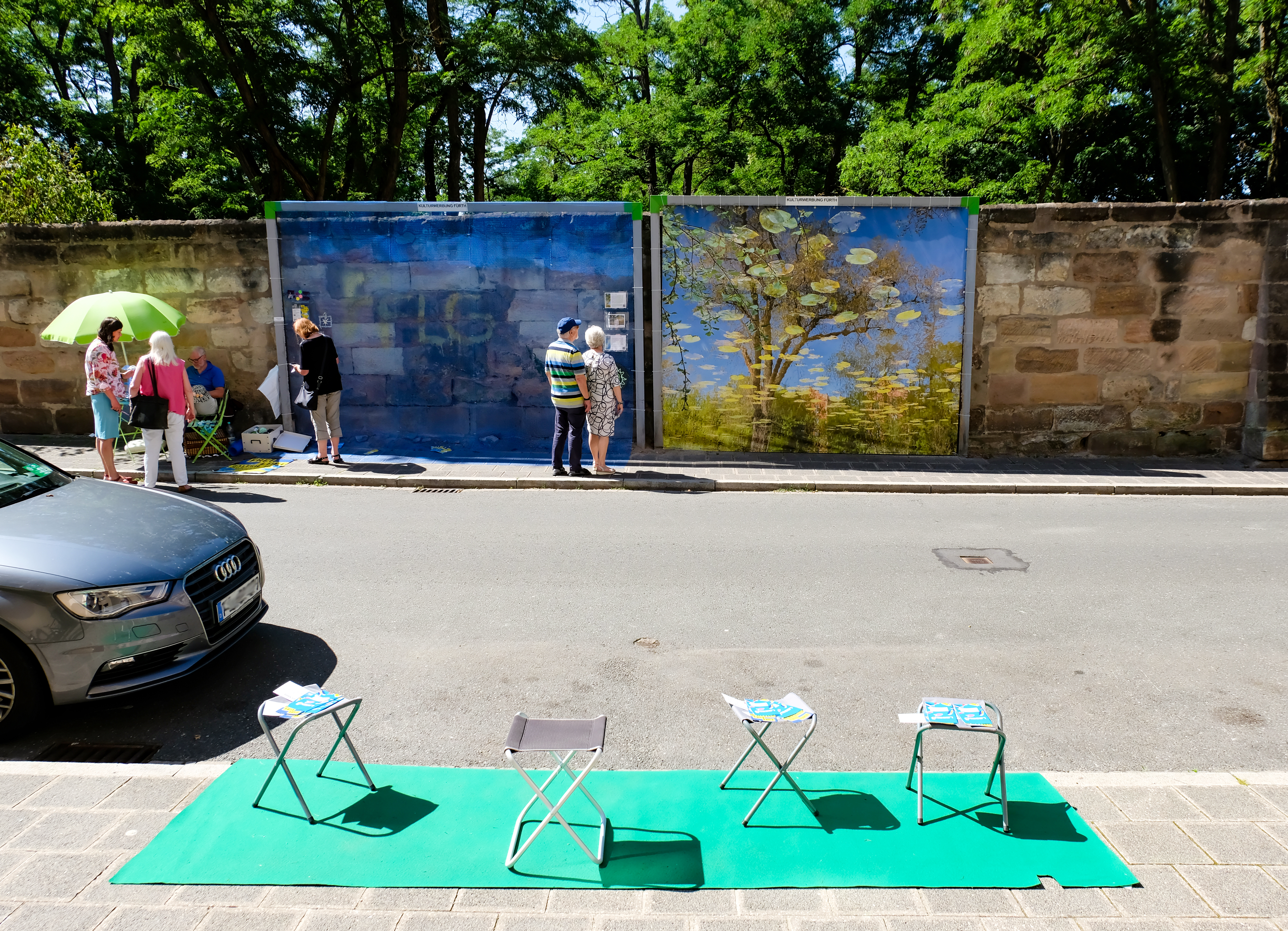 BeschreibungKunstinstallation (Wechselrahmen mit Himmelsee & Schöpfungsgarten) von Ulrike Irrgang am alten jüdischen Friedhof während der Frei Luft Galerie 2023, Juni 2023