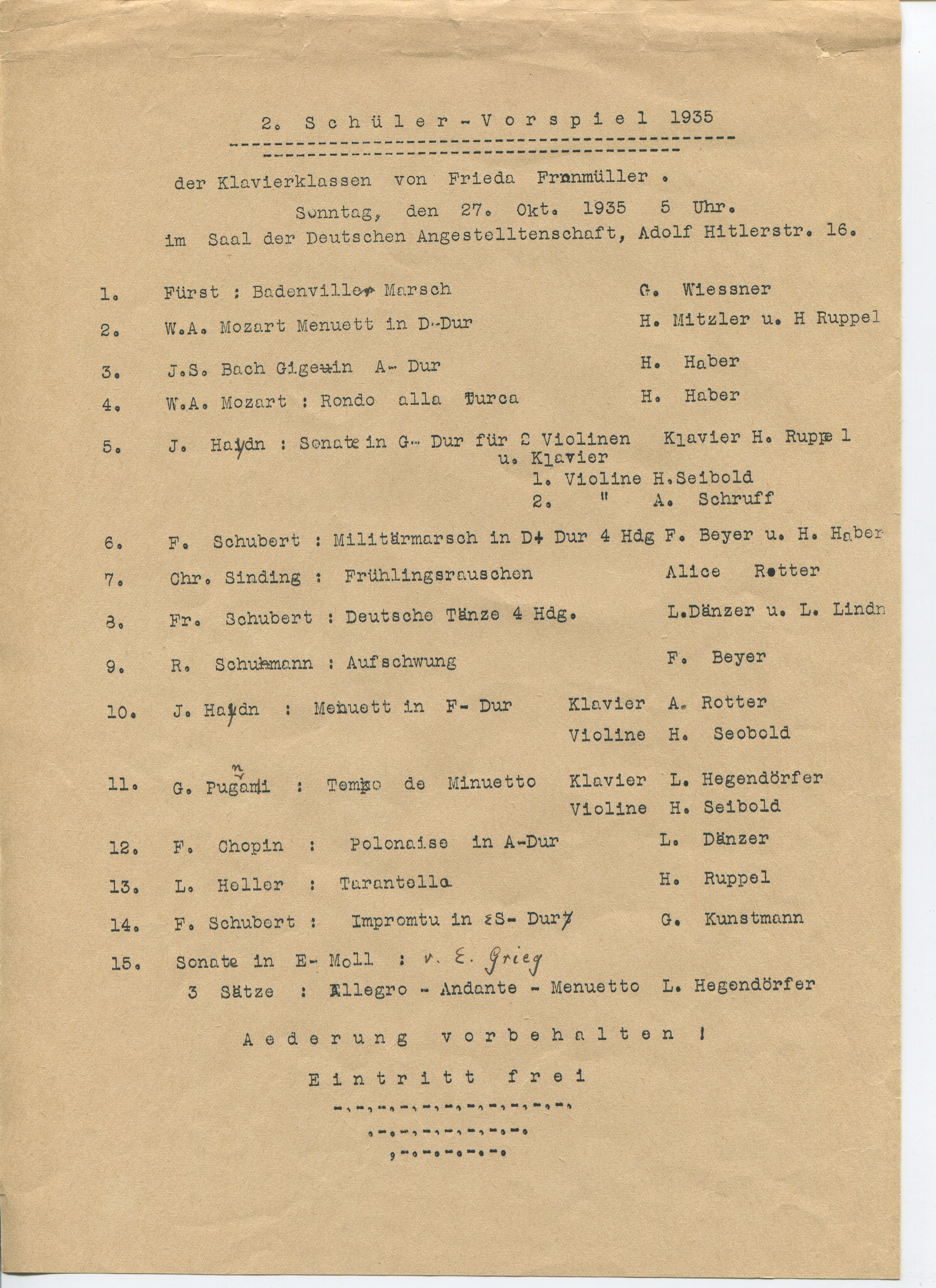 | Beschreibung | Schüler-Vorspiel der Klavierklassen veranstaltet Frieda Fronmüller ehem. Gewerkschaftshaus "Deutschen Angestelltenschaft" in der heutigen Königswarterstraße 16, Okt. 1935 | ||