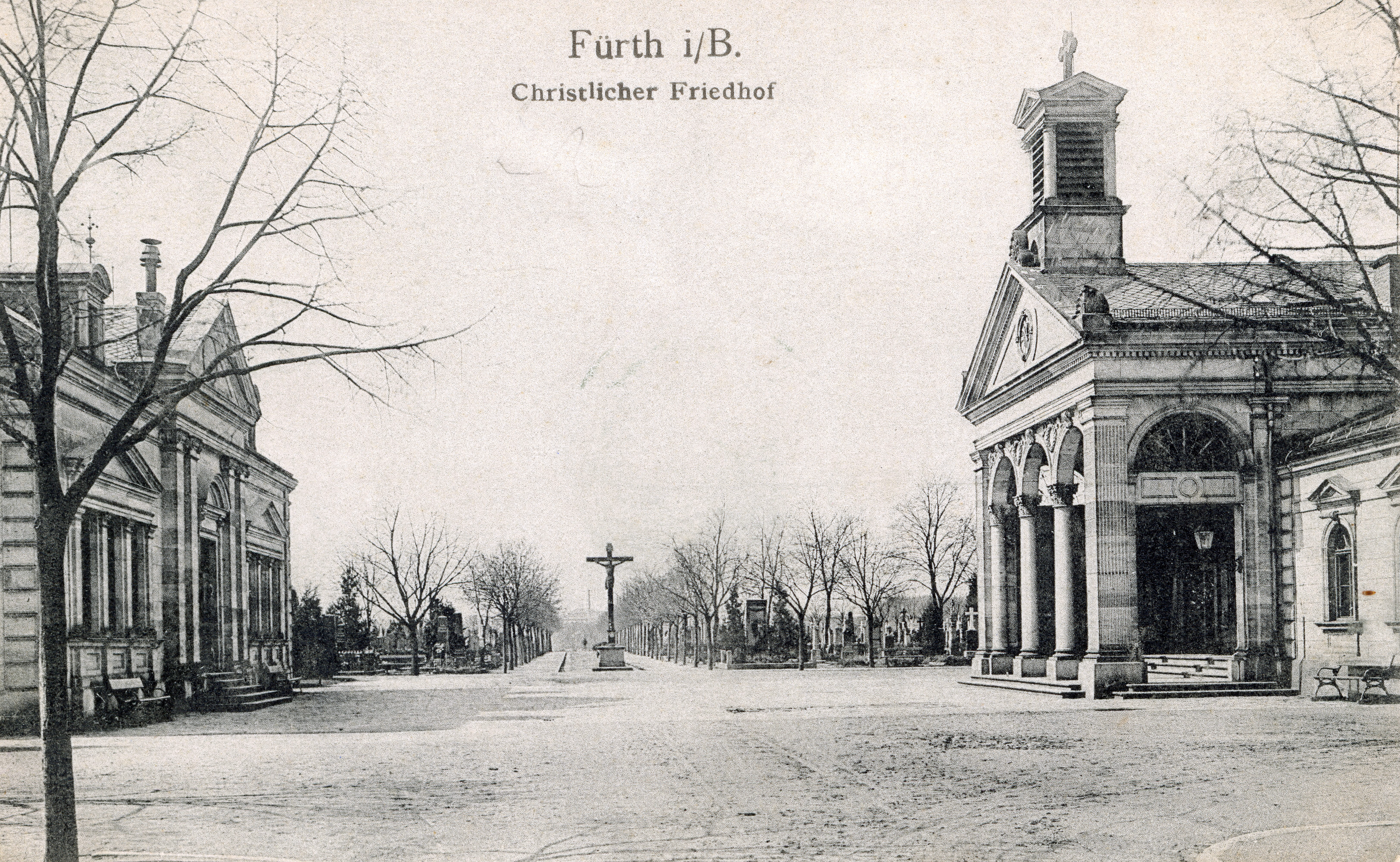 | Beschreibung | Friedhof an der Erlanger Straße, im Bild Leichen- und Aussegnungshalle (Ansichtskarte gelaufen am 13. Juli 1908) | ||