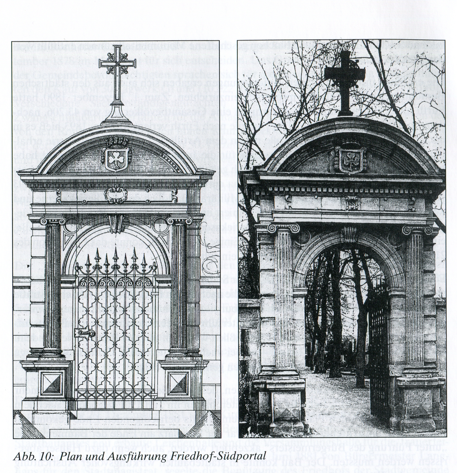 Friedhof Eingang Mauerstraße Vergleich Plan vom Stadtbauamt 1878 zum tatsächlichen Tor 1881 aus "Fürther Geschichtsblätter" Nr. 2 2002 S. 36
