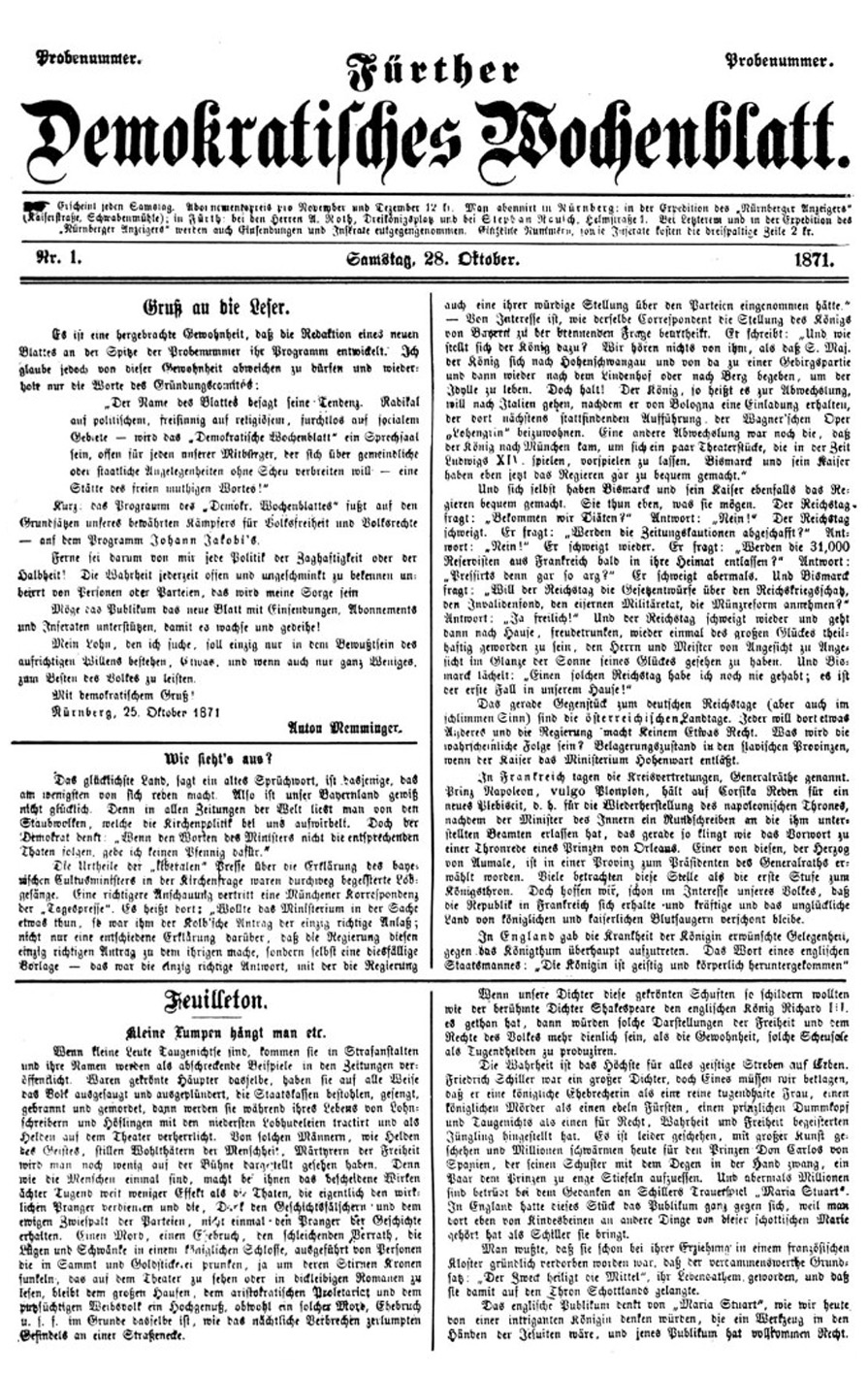 | Dateiinfo (Bild-Unterschrift und Info-Box, automatisch erstellt) | Erste Ausgabe des Fürther Demokratischen Wochenblattes vom 28. Oktober 1871. Lizenz: cc-by-sa-3.0 | ||