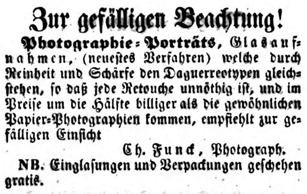 | Dateiinfo (Bild-Unterschrift und Info-Box, automatisch erstellt) | Zeitungsannonce des Daguerreotypisten Christian Funck, November 1853 Erstellungsdatum: 1853<br>Lizenz: noc-nc-1.0 | ||