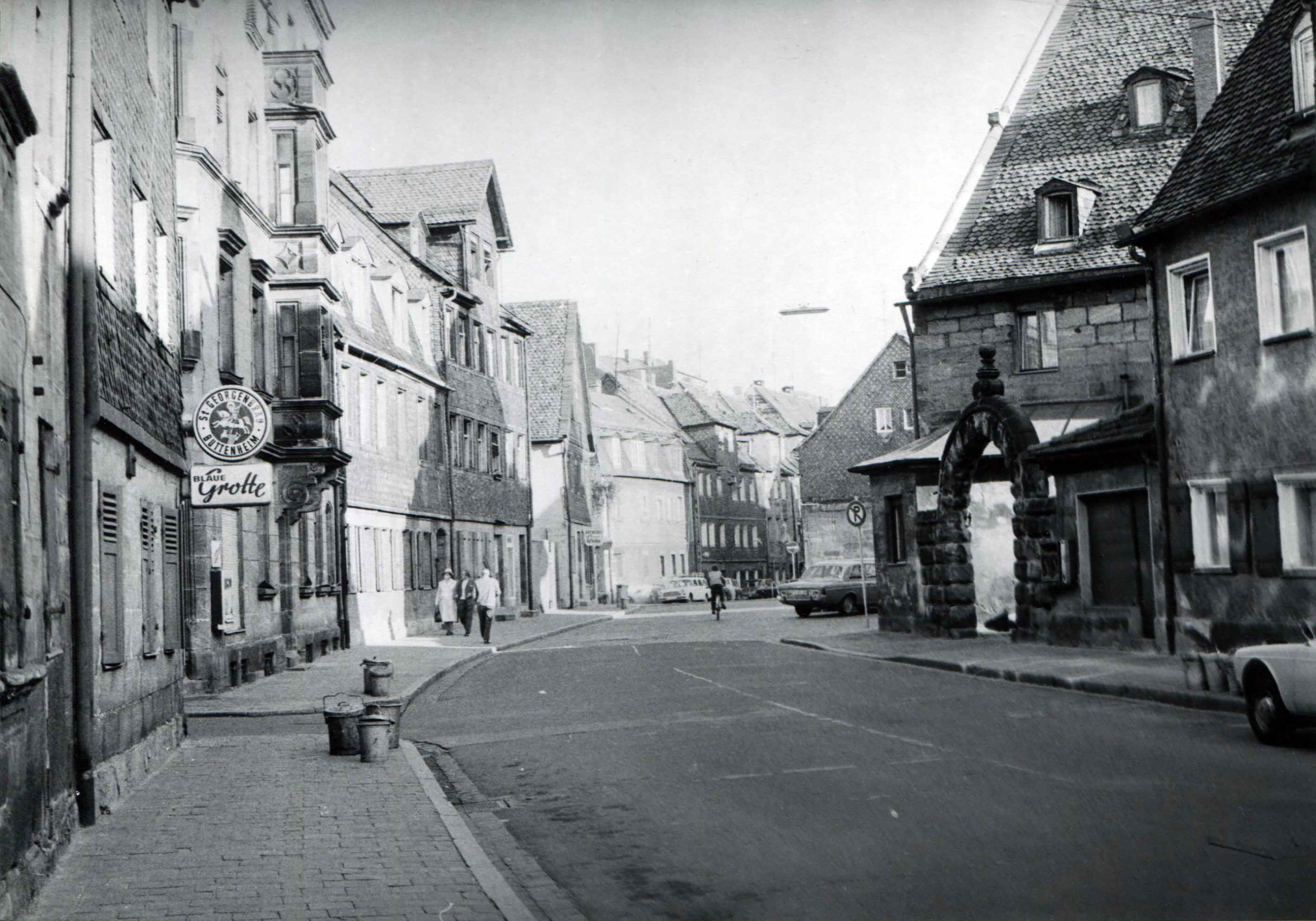 | Beschreibung | Blick in die Lilienstraße, rechts der Fraveliershof, links die Gaststätte Blaue Grotte, im Hintergrund Gebäude der Wasserstraße, ca. 1970 | ||