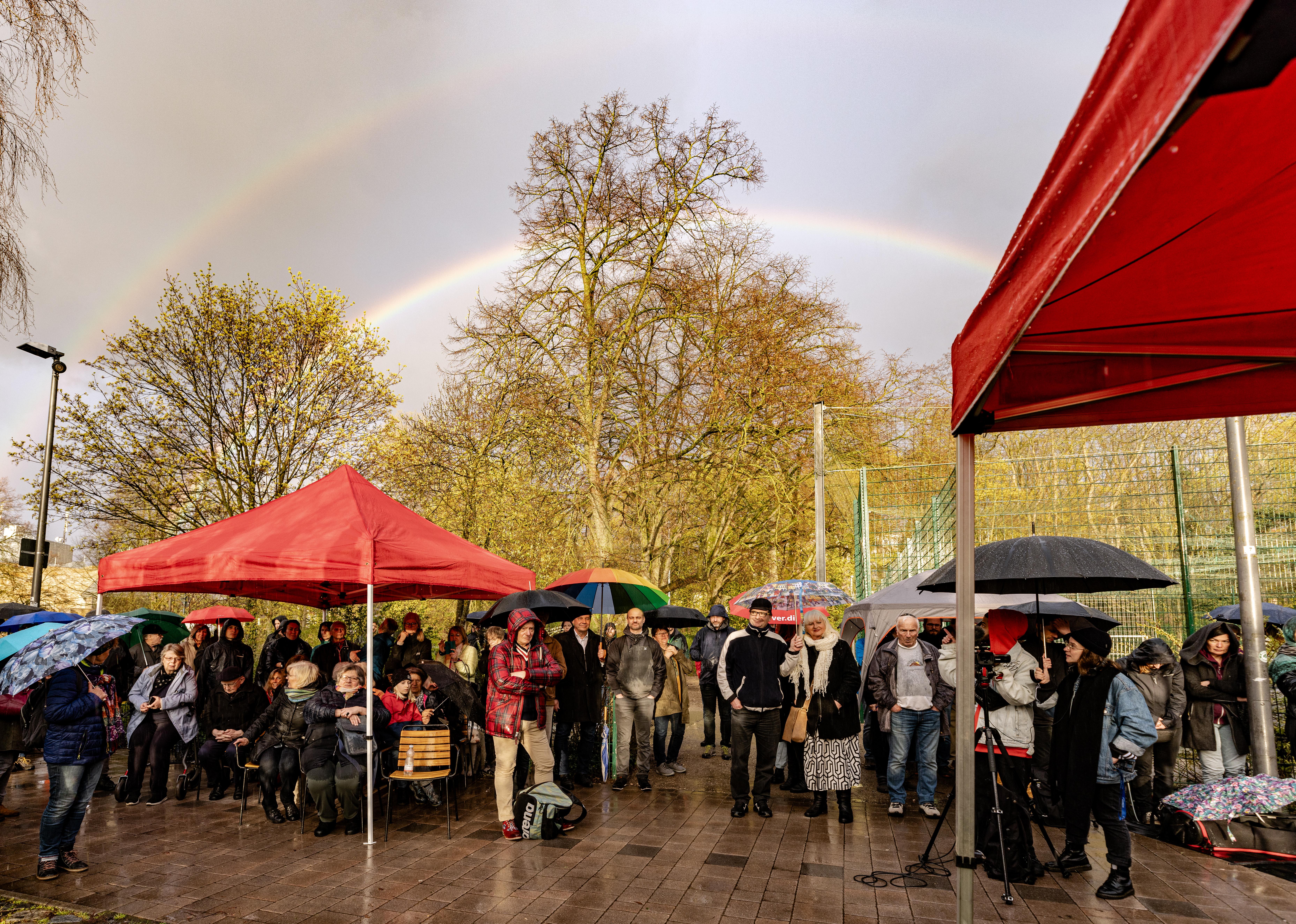| Beschreibung | Gedenkveranstaltung an die Ermordung von Dr. Rudolf Benario und Ernst Goldmann an der Uferpromenade unter einem Regenbogen, April 2023 | ||