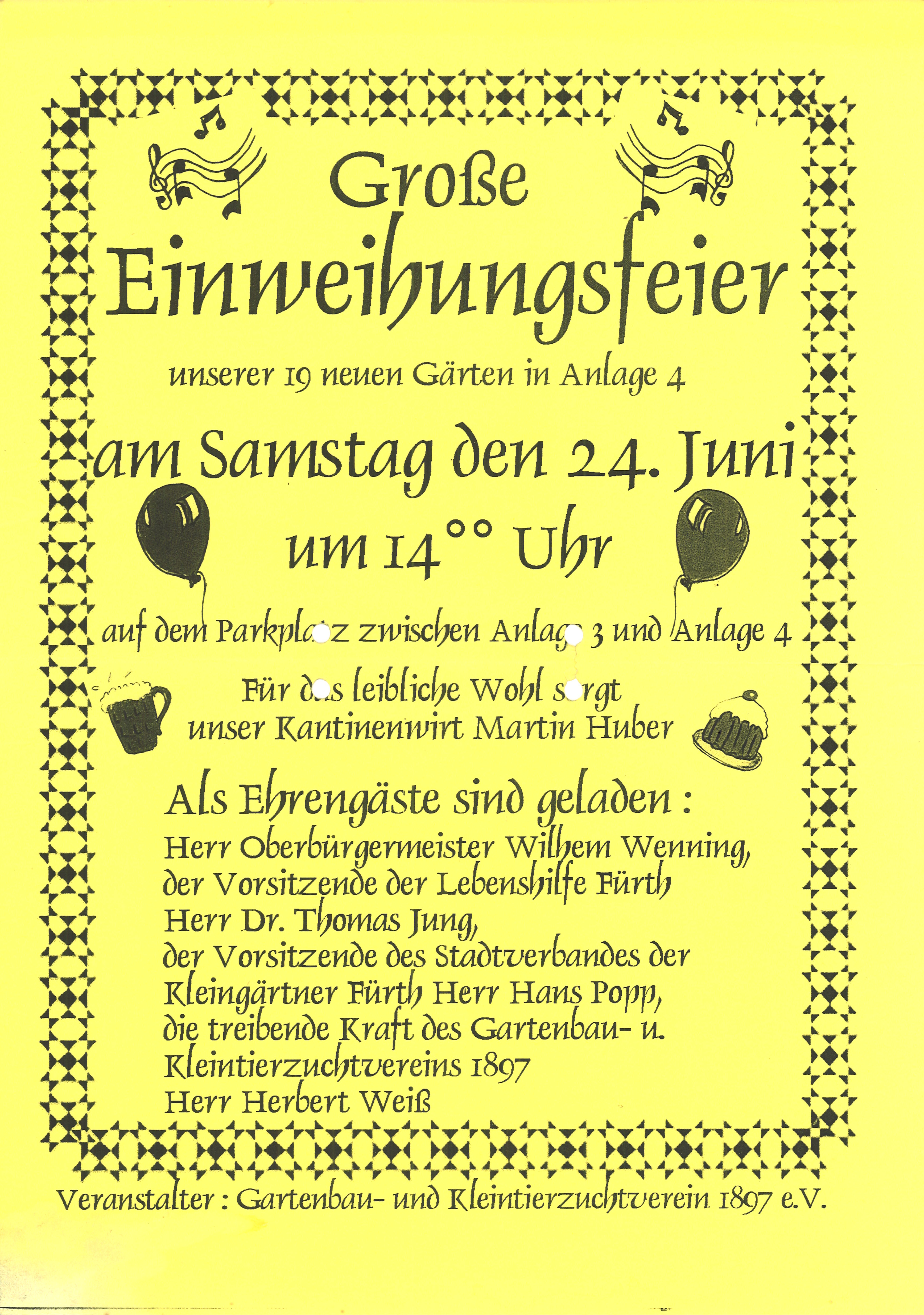 | Dateiinfo (Bild-Unterschrift und Info-Box, automatisch erstellt) | Aushang zur Einweihung der neuen Gärten des GBV Fürth 1897, 2000. Urheber: GBV Fürth 1897 e. V.<br>Erstellungsdatum: 24. Juni 2000<br>Lizenz: copyright | ||