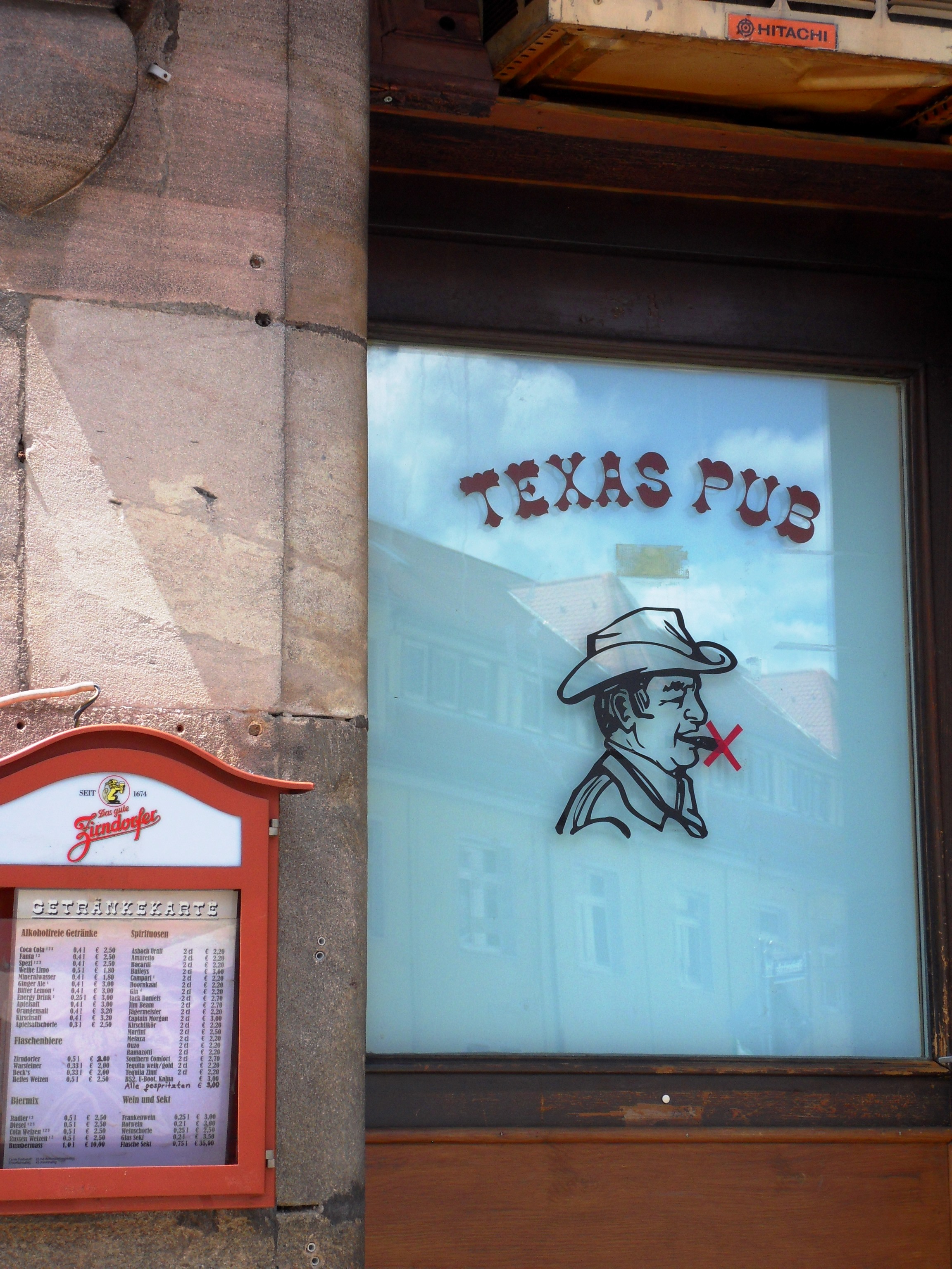 | Beschreibung | Gaststätte Texas Pub 2011 als das Rauchverbot in Wirtshäusern in Kraft trat. Die Zigarette im Mund des Cowboys ist durchgestrichen. | ||