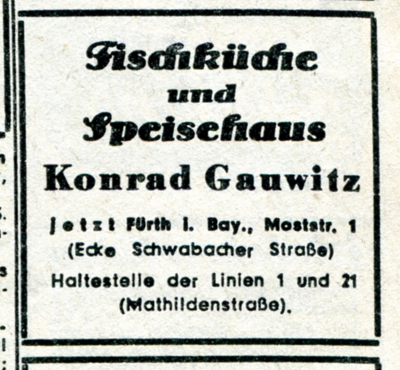 | Dateiinfo (Bild-Unterschrift und Info-Box, automatisch erstellt) | Werbeanzeige in der FN vom 19.3.1949 der (längst vergessenen) Fischküche und Speisehaus Gauwitz in ... Werbeanzeige in der FN vom 19.3.1949 der (längst vergessenen) Fischküche und Speisehaus Gauwitz in der Moststraße 1<br>Urheber: Fürther Nachrichten<br>Erstellungsdatum: 19. August 1949<br>Lizenz: cc-by-sa-3.0 | ||