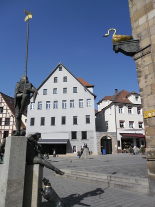 an der Ecke ... Das Hauszeichen des Goldenen Schwans und einige Plastiken des Gauklerbrunnens<br> an der Ecke Königstraße/Marktplatz, im Hintergrund die Anwesen Marktplatz 1 (links) u. 3 (rechts)<br>Urheber: Aarp65<br>Erstellungsdatum: 2009<br>Lizenz: cc-by-sa-3.0