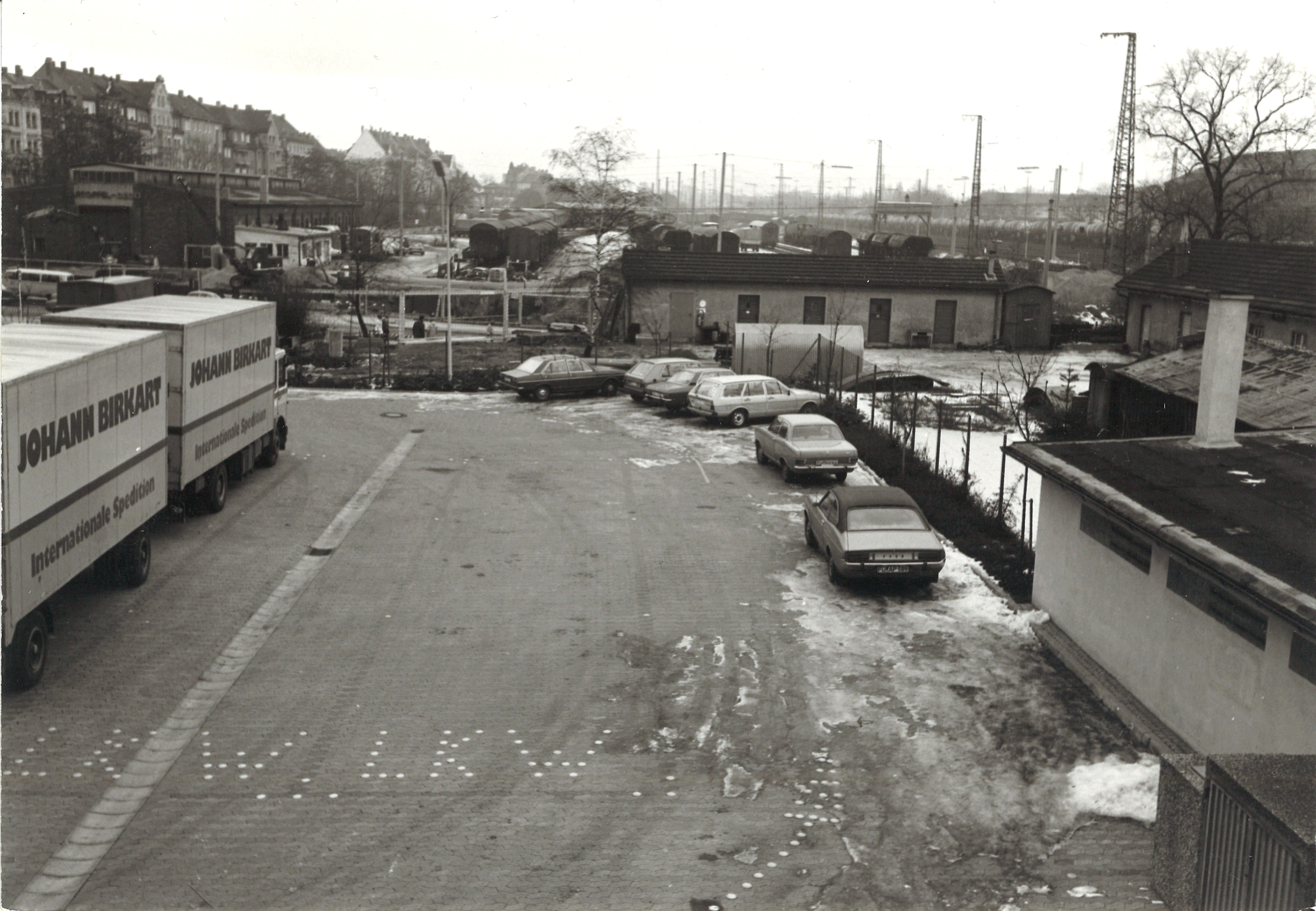 Gebhardtstraße mit Güterbahnhof in Blickrichtung Jakobinenstraße. Parkplatz des Zollamtes, im ... Gebhardtstraße mit Güterbahnhof in Blickrichtung Jakobinenstraße. Parkplatz des Zollamtes, im Hintergrund beginnen die Vorarbeiten zum U-Bahnbau<br>Urheber: unbekannt<br>Erstellungsdatum: Februar 1979<br>Lizenz: cc-by-sa-3.0