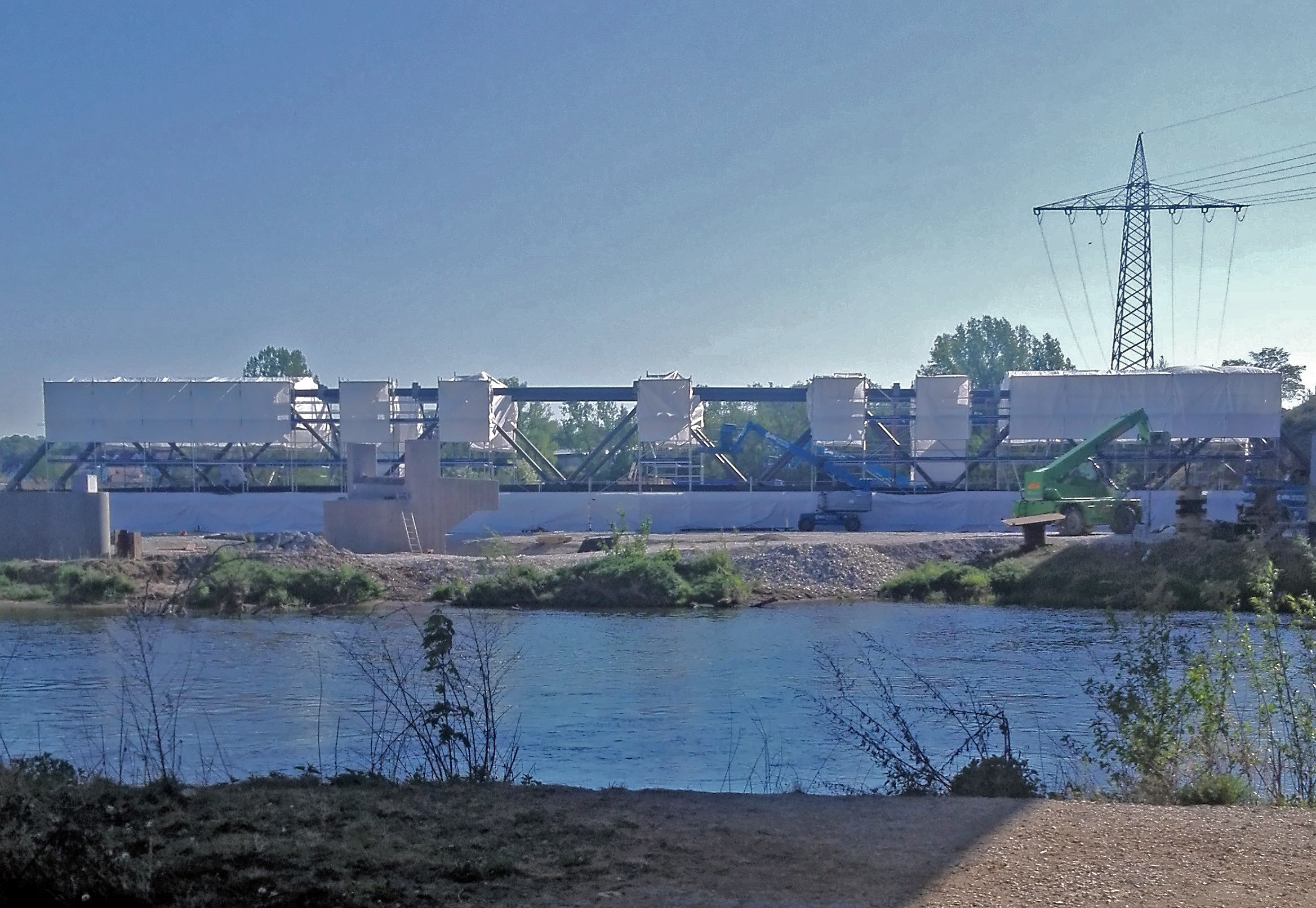 | Beschreibung | Arbeiten an der noch nicht eingehobenen Geh- und Radwegbrücke Regnitz, April 2020 | ||