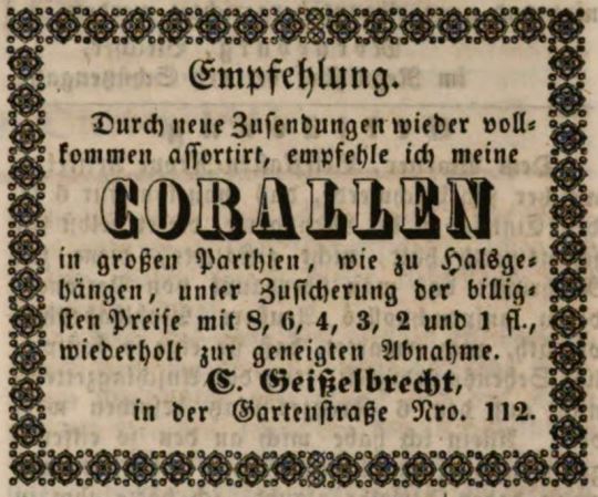 | Beschreibung | Zeitungsannonce des Juweliers Conrad Geißelbrecht, Oktober 1844 | ||