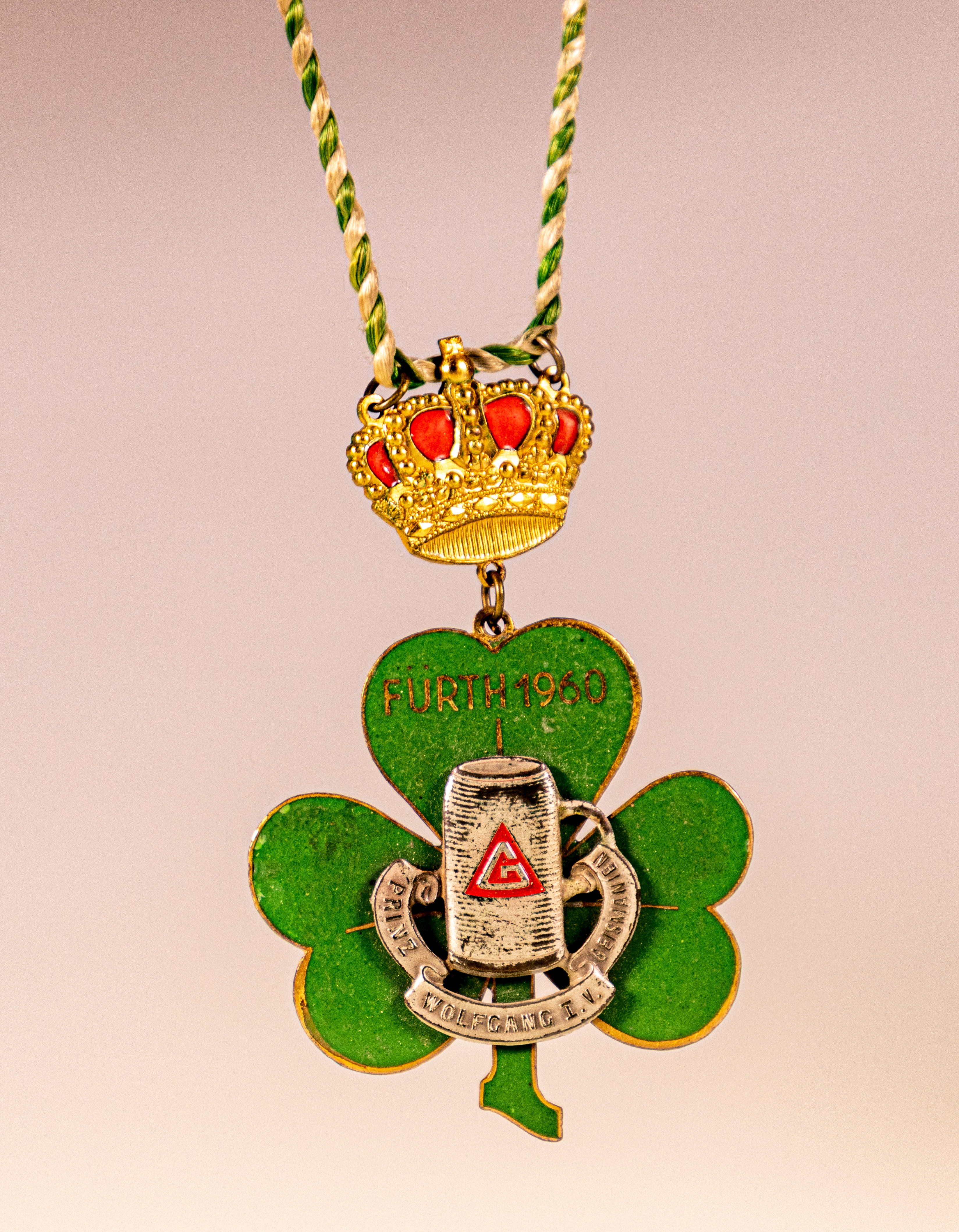 | Beschreibung | Sessionsorden der CFK, Saison 1960, Metall, Motiv „Prinz Wolfgang I. von Geismanien“ mit Geismann-Maßkrug | ||