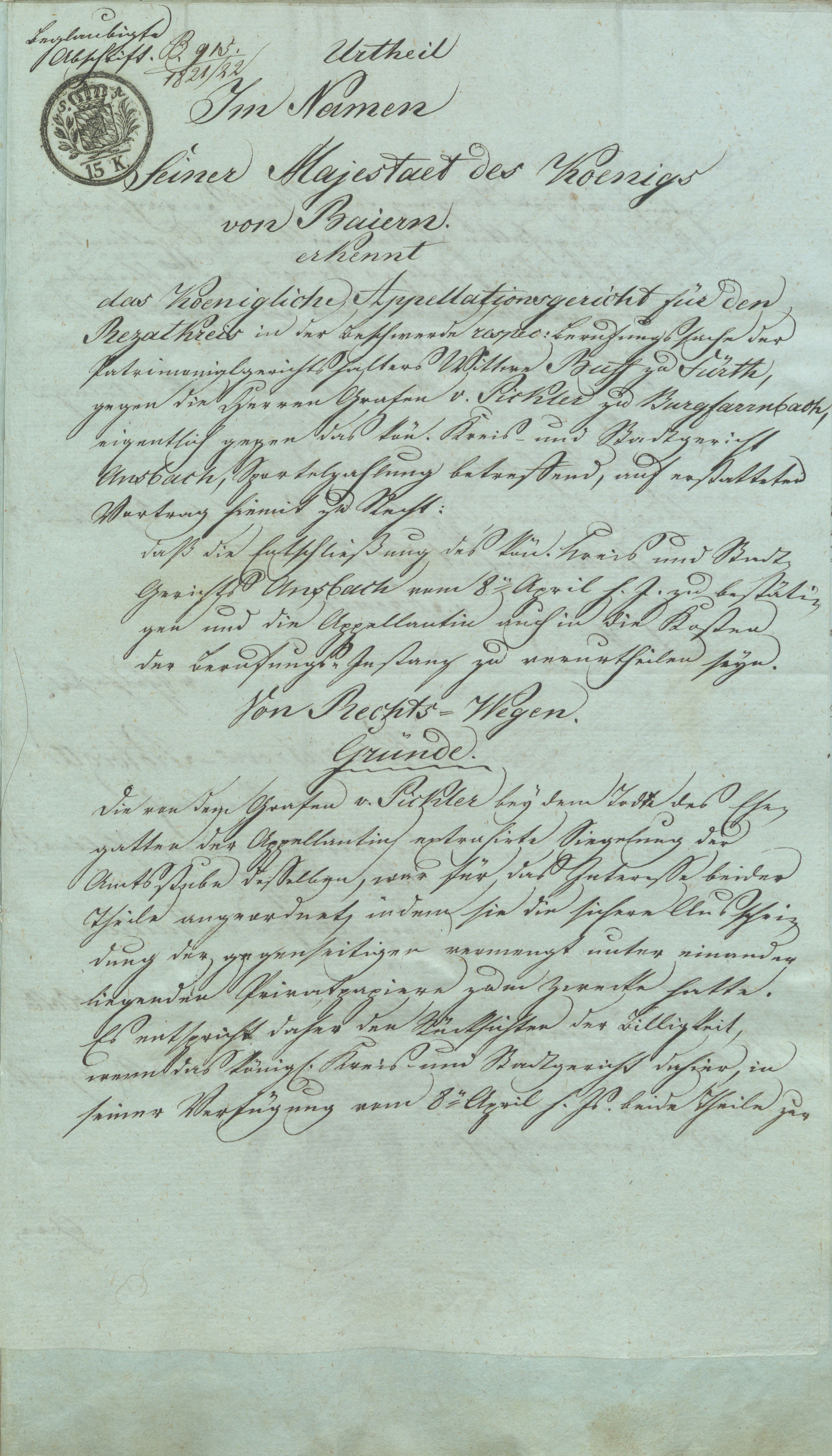 | Beschreibung | Urteil des Königlichen Appellationsgerichts des Rezatkreises in Ansbach vom 5. August 1823 (Seite 1) | ||