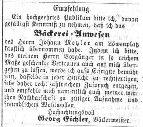 | Dateiinfo (Bild-Unterschrift und Info-Box, automatisch erstellt) | Geschäftsübernahme des Bäckerei-Anwesens Metzler durch Bäckermeister Georg Eichler (FT 7. Mai 1868) Erstellungsdatum: 7. Mai 1868<br>Lizenz: noc-nc-1.0 | ||