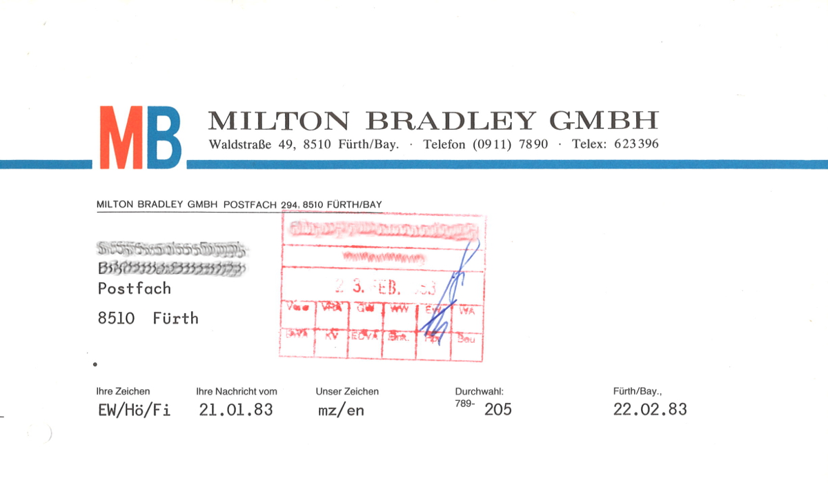 | Dateiinfo (Bild-Unterschrift und Info-Box, automatisch erstellt) | Historischer Briefkopf der Firma MILTON BRADLEY, 1983 Urheber: MILTON BRADLEY GMBH<br>Erstellungsdatum: 22. Februar 1983<br>Lizenz: cc-by-sa-3.0 | ||