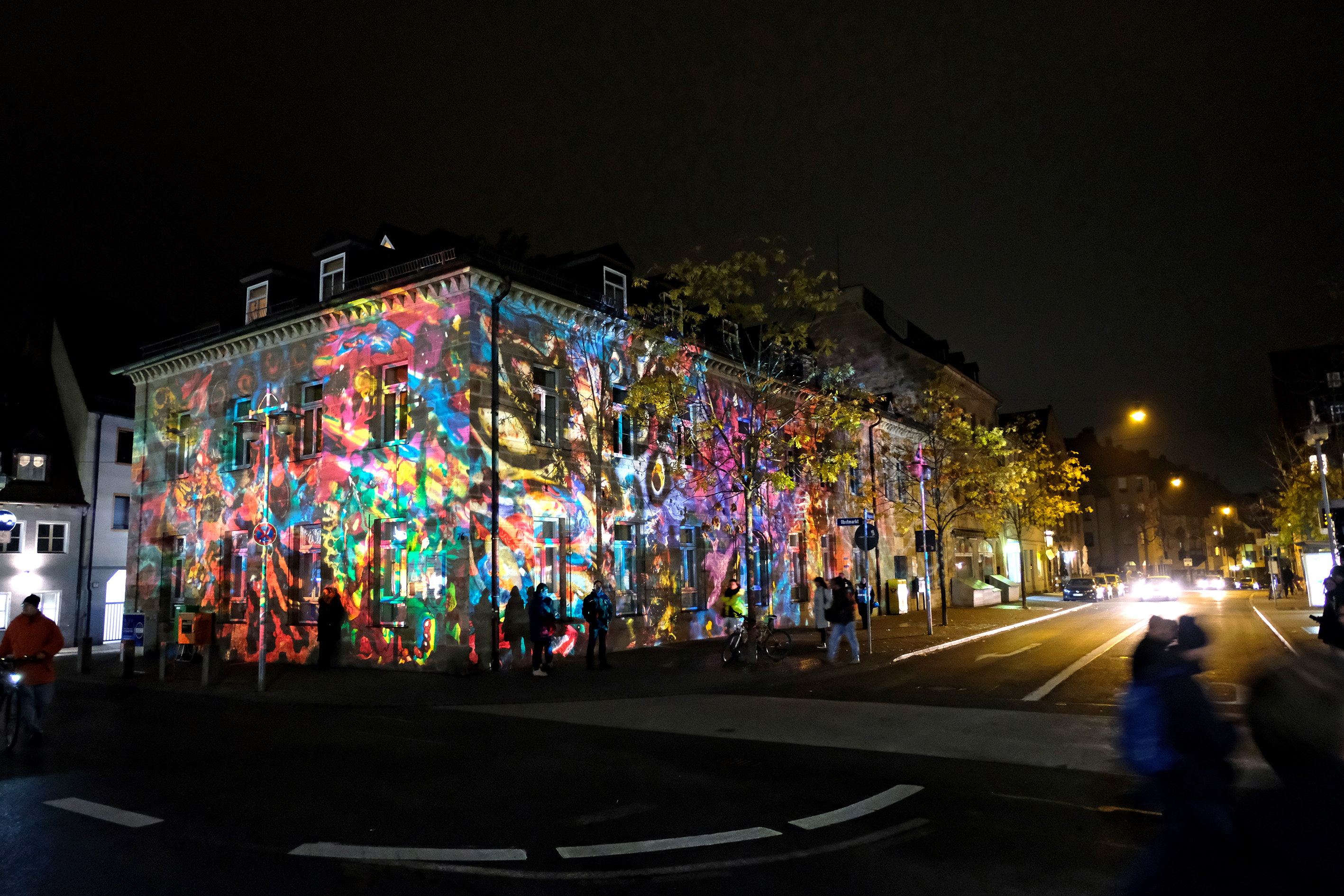 BeschreibungKönigstraße 76 bei der Veranstaltung Fürther Glanzlichter anlässlich der Feierlichkeiten "200 Jahre eigenständig" der Stadt Fürth, 2018 - Installation vom Künstlerkollektiv Dunkelstorm *2015