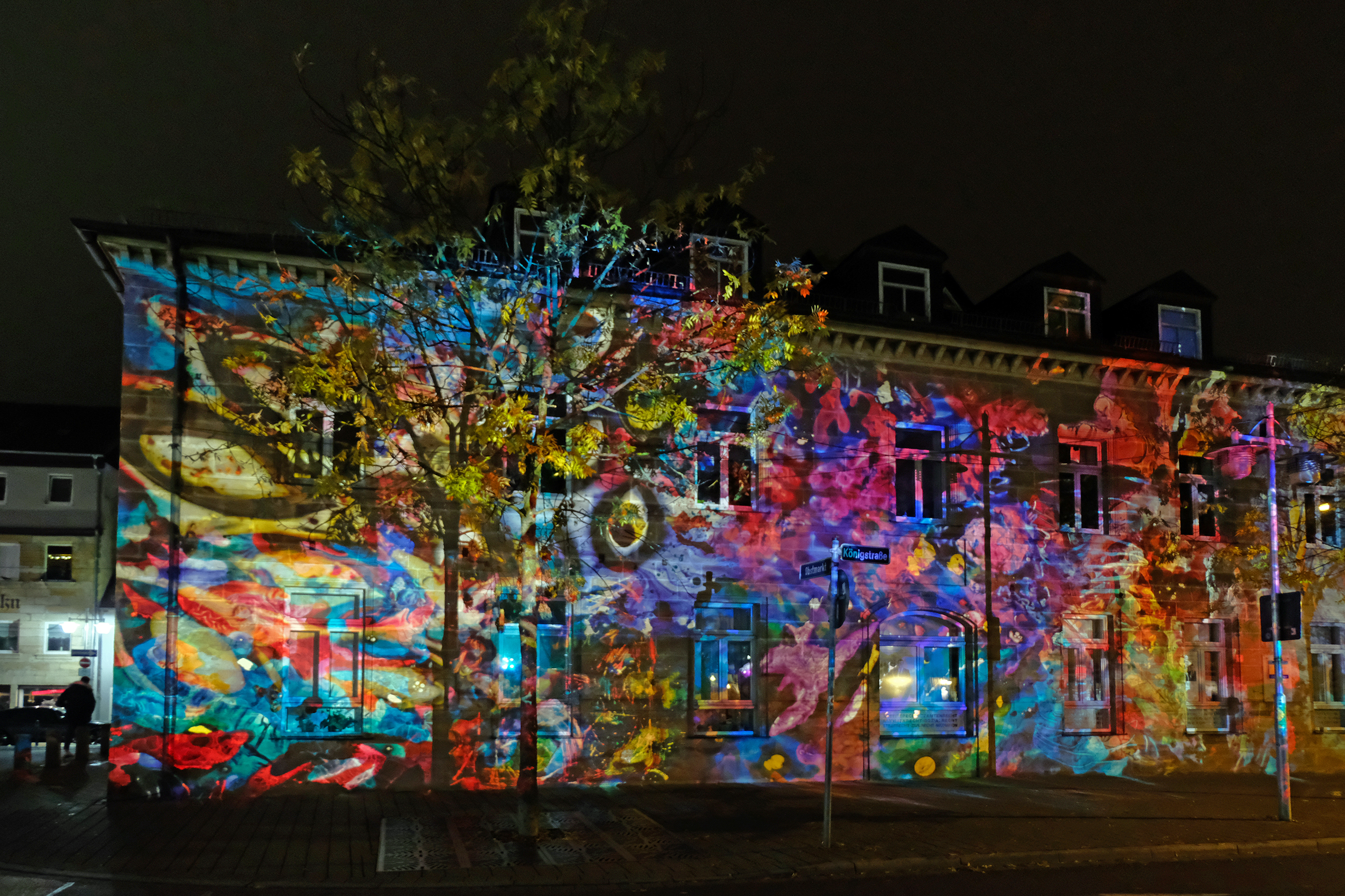 | Beschreibung | Königstraße 76 bei der Veranstaltung Fürther Glanzlichter anlässlich der Feierlichkeiten "200 Jahre eigenständig" der Stadt Fürth, 2018 - Installation vom Künstlerkollektiv Dunkelstorm *2015 | ||