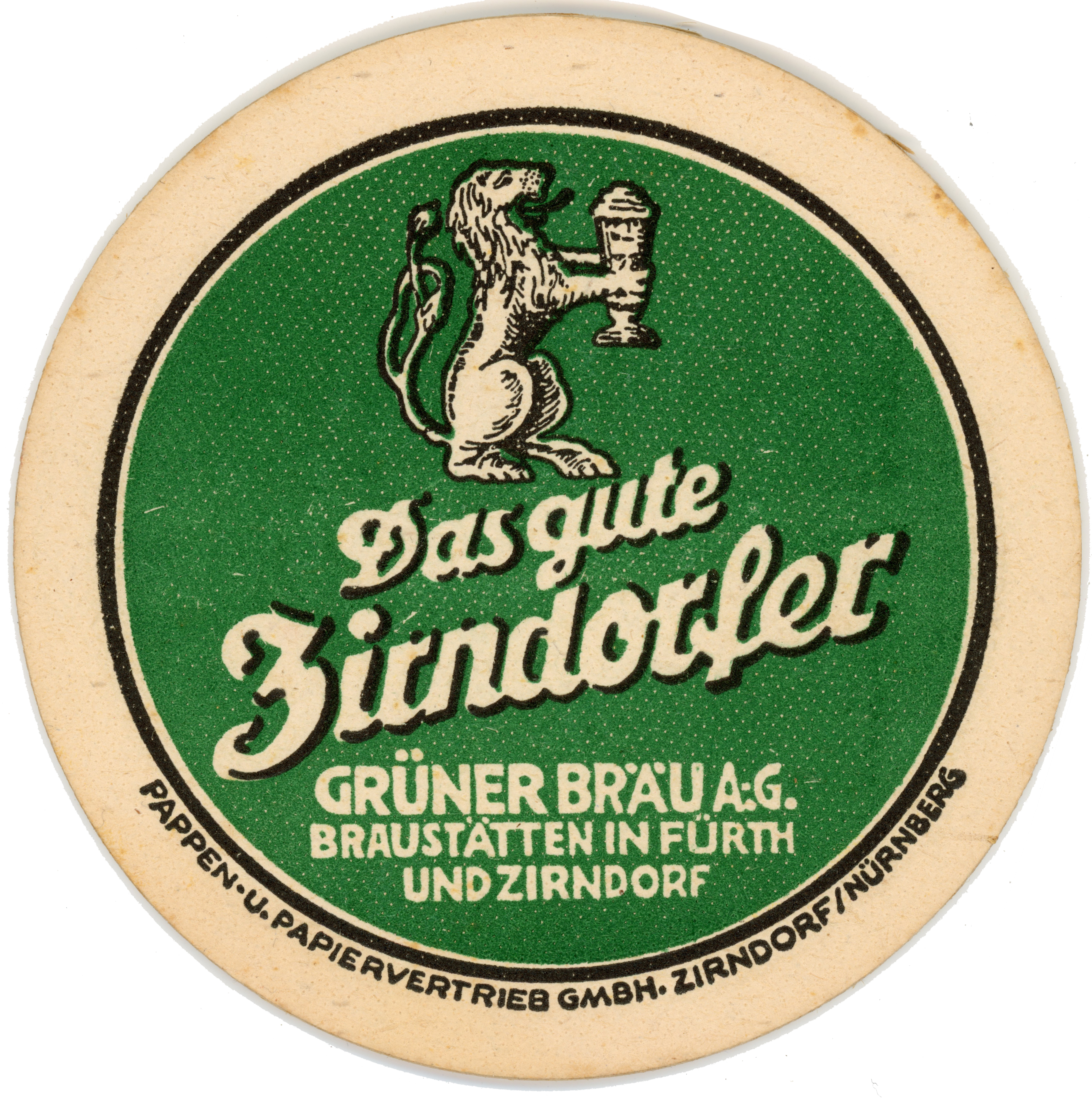 | Beschreibung | Bierdeckel der Brauerei Grüner für das Zirndorfer Bier | ||