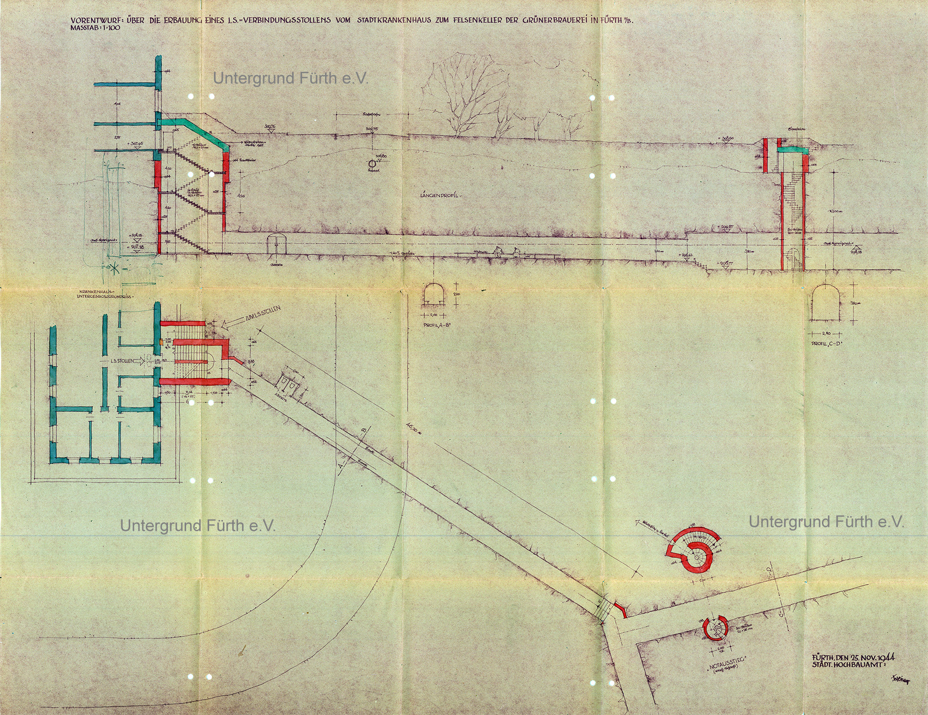 | Dateiinfo (Bild-Unterschrift und Info-Box, automatisch erstellt) | Geplanter Verbindungsgang vom Grünerkeller zum Klinkum Fürth, nie realisiert. Hier die Planungen von ... Geplanter Verbindungsgang vom Grünerkeller zum Klinkum Fürth, nie realisiert. Hier die Planungen von November 1944.<br>Urheber: Stadt Fürth<br>Erstellungsdatum: 25. November 1944<br>Lizenz: cc-by-sa-3.0 | ||