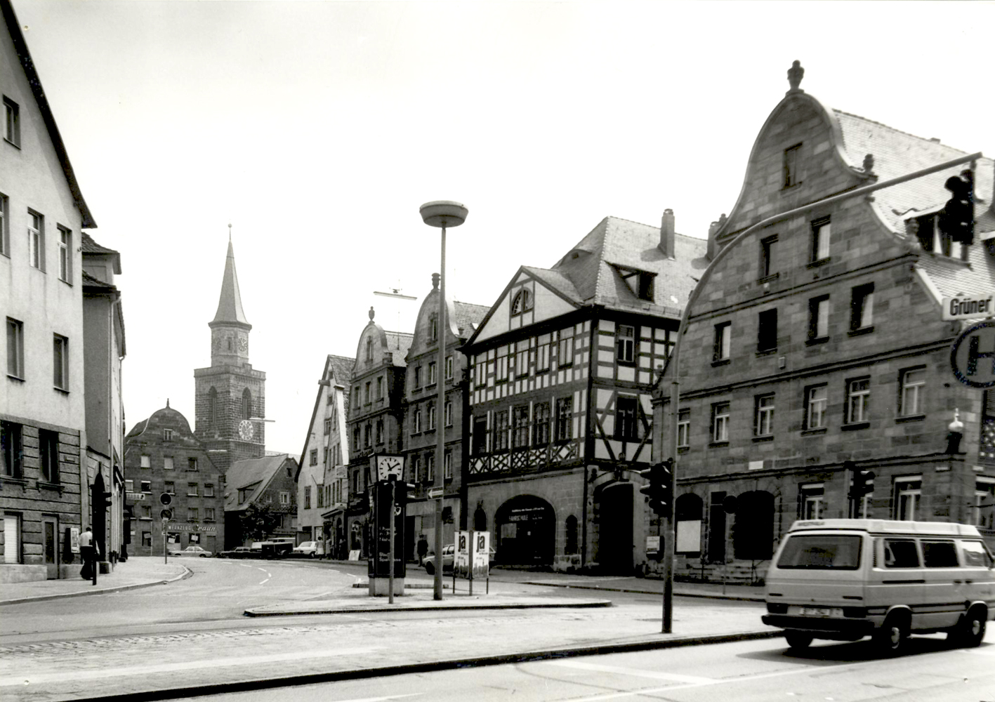 | Beschreibung | Marktplatz vor der Verkehrsberuhigung, rechts im Bild: Gaststätte „Zum Gold’nen Schwan“ | ||
