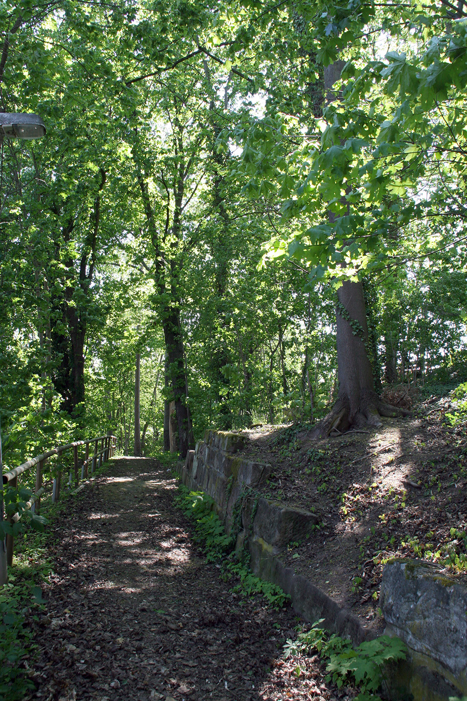 | Beschreibung | Ehem. Grüner Park, heute stadtökologischer Lehrpfad – aktuell seit 2014 gesperrt, im Hintergrund Jakob-Henle-Straße 38, rechts im Bild evtl. ehem. Reste des Meierskellers (Aufnahme 2016) | ||
