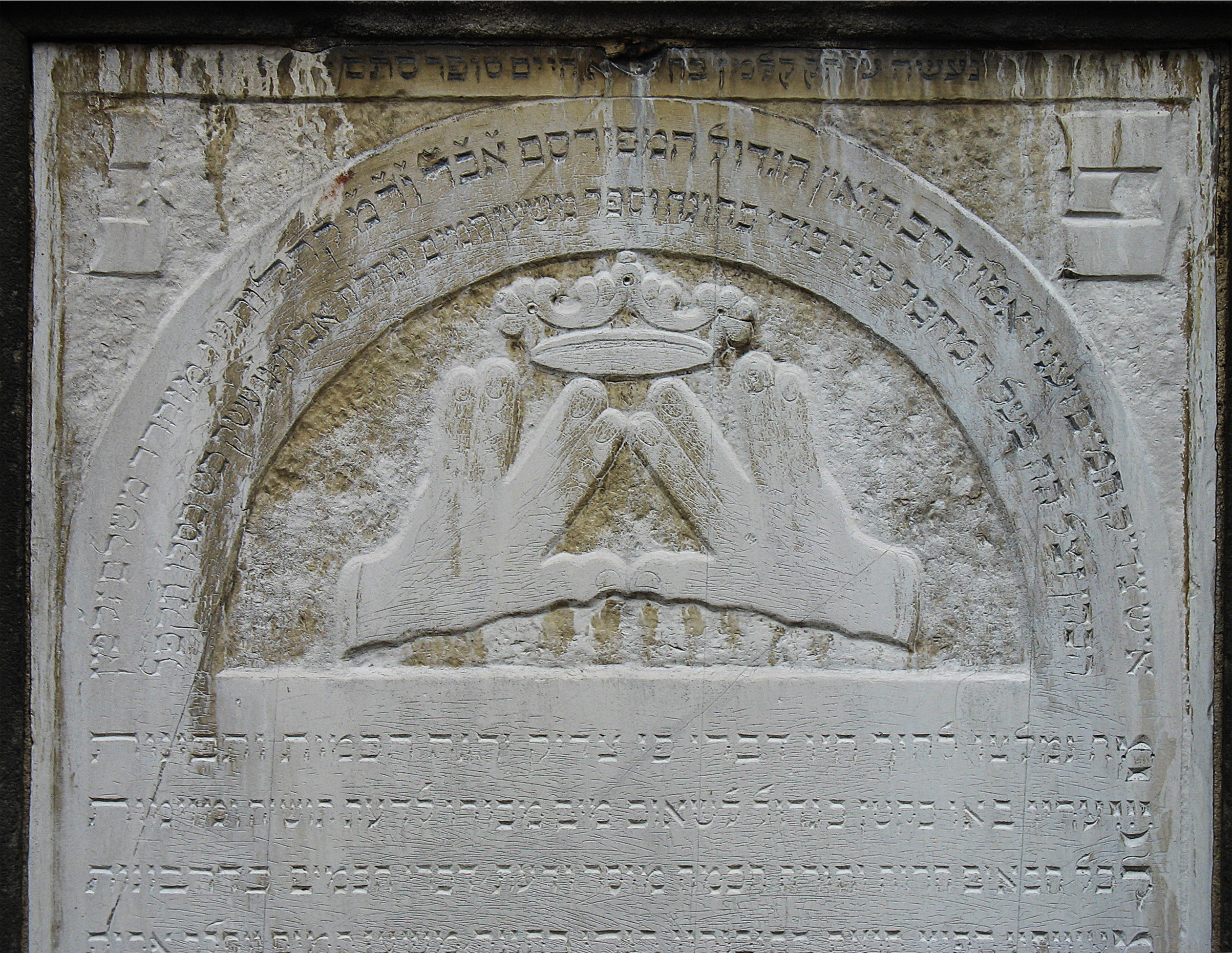 Grabstein am alten jüdischen Friedhof in Fürth. Zu sehen sind die segnenden Hände des Kohen während er den Aaronitischen Segen spricht. Die Krone darüber weist auf die Priesterwürde hin.