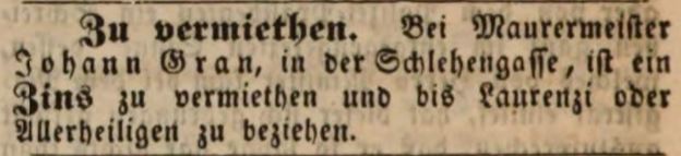 | Beschreibung | Bei Maurermeister Johann Gran in der Schlehengasse ist eine Wohnung zu mieten, Mai 1847 | ||