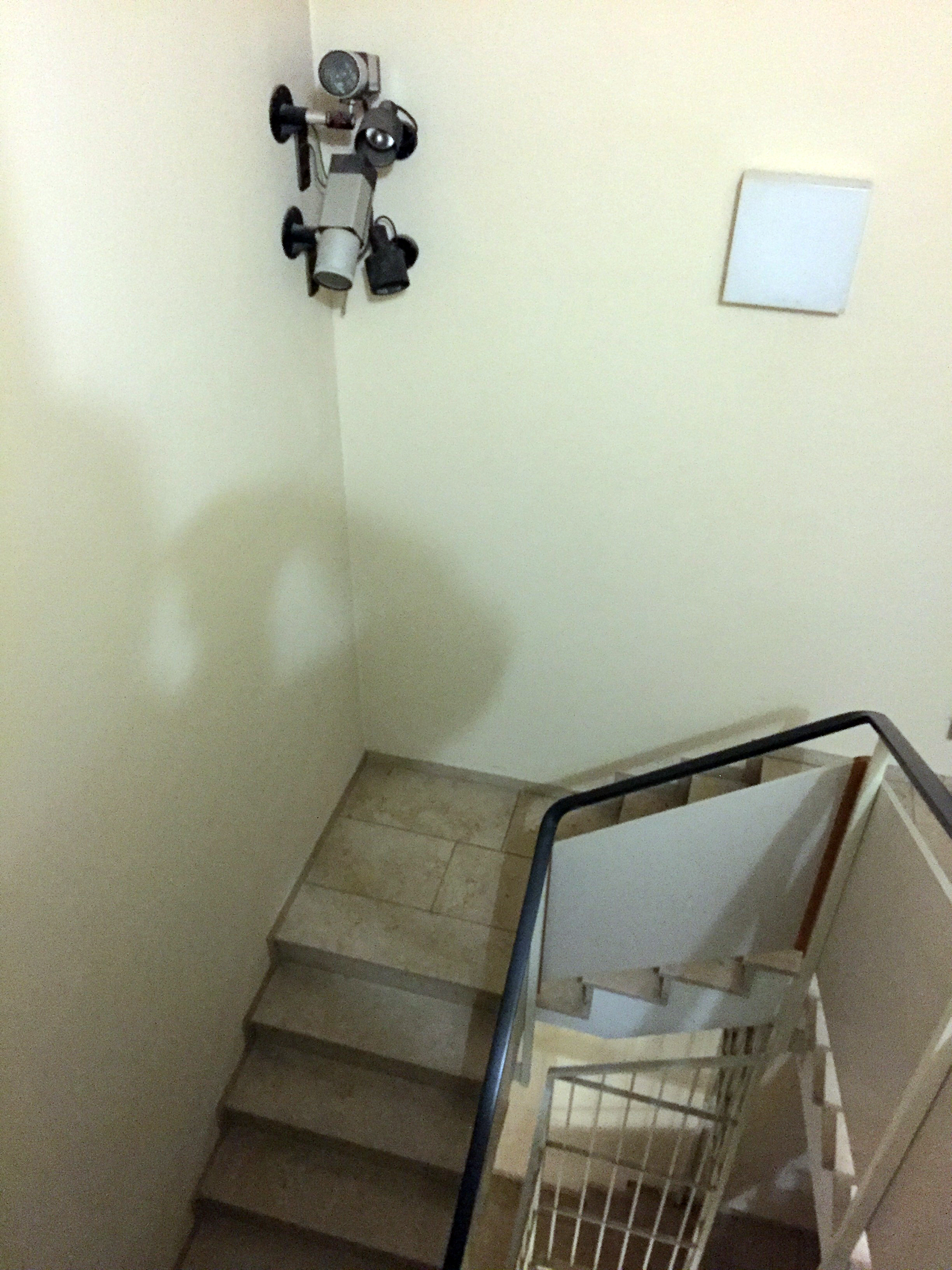 | Beschreibung | Ehem. Überwachungsanlagen im Treppenhaus vor der Suite von Max Grundig im Hotel Forsthaus im 5. OG, 2018 | ||