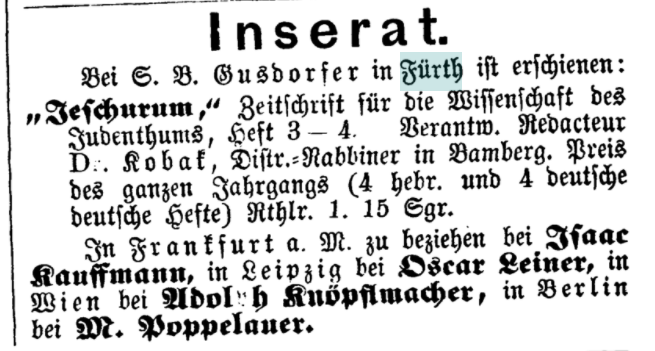 | Beschreibung | Inserat S.B.Gusdorfer, Der Israelit vom 12.12.1864 | ||