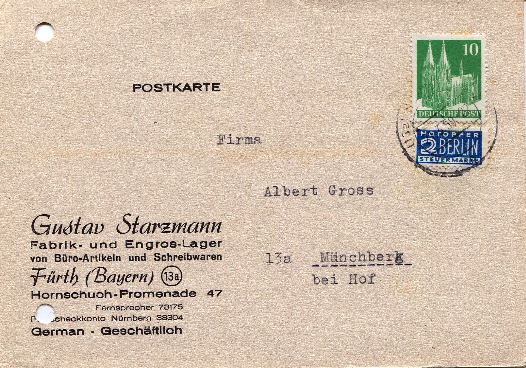 | Beschreibung | Büro-Artikel und Schreibwaren Gustav Starzmann in der Hornschuchpromenade 47, 1950 | ||