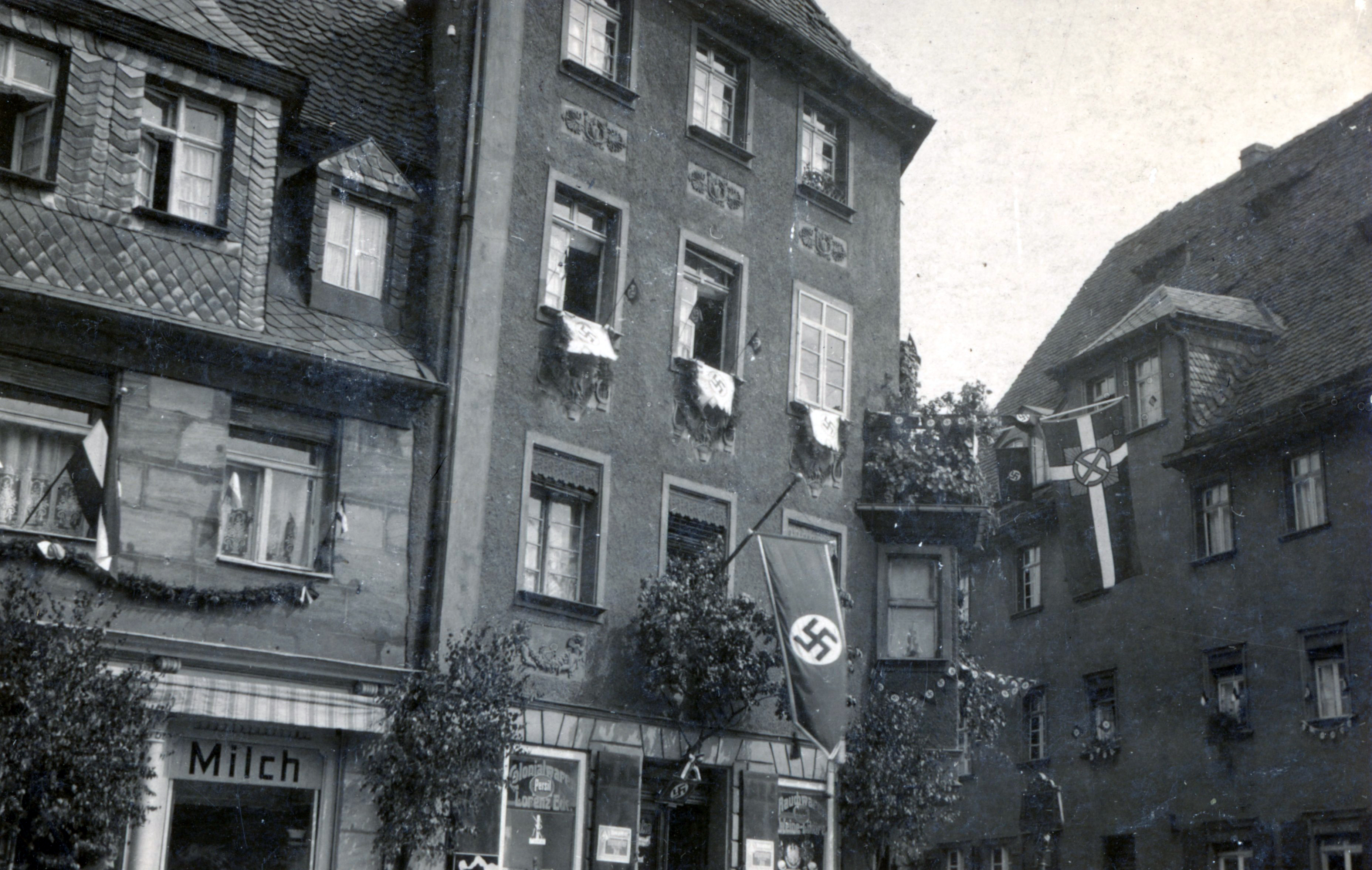 BeschreibungDas Gebäude Gustavstraße 54 mit entsprechender NS-Beflaggung, 1942