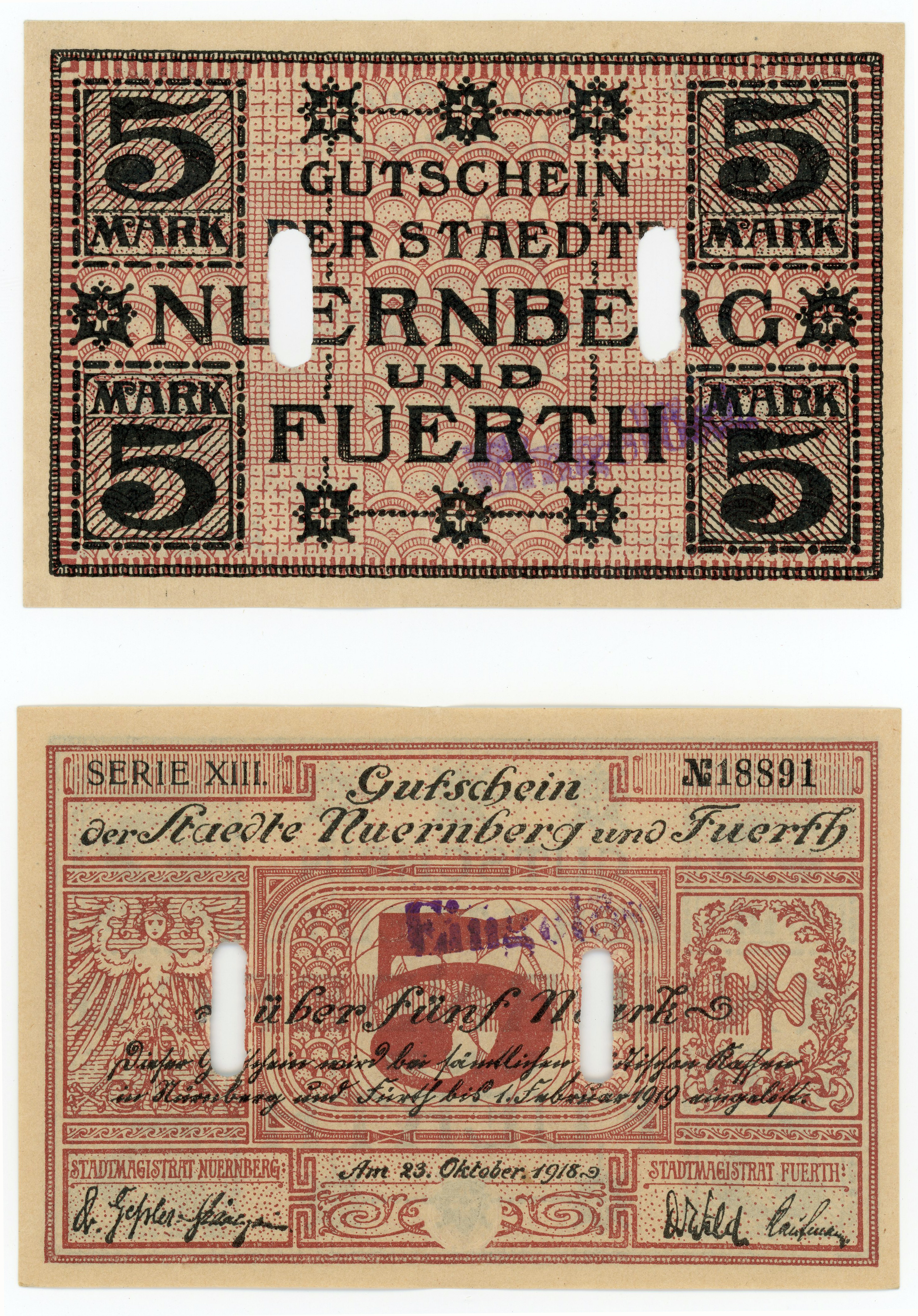 | Beschreibung | Gutschein der Städte Nürnberg und Fürth über 5 DM, Okt. 1918 | ||