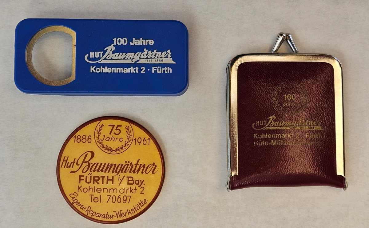 | Beschreibung | Jubläumsgeschenke für Kunden: Flaschenöffner, Nähzeug, Taschenspiegel | ||