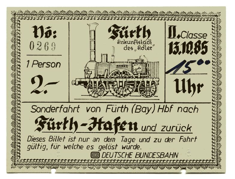| Beschreibung | Fahrkarte der Eisenbahn Sonderfahrt Fürth Hbf. zum Hafen Fürth auf der Hafenbahn-Trasse zur 150 Jahrfeier Deutsche Eisenbahn 1985 | ||