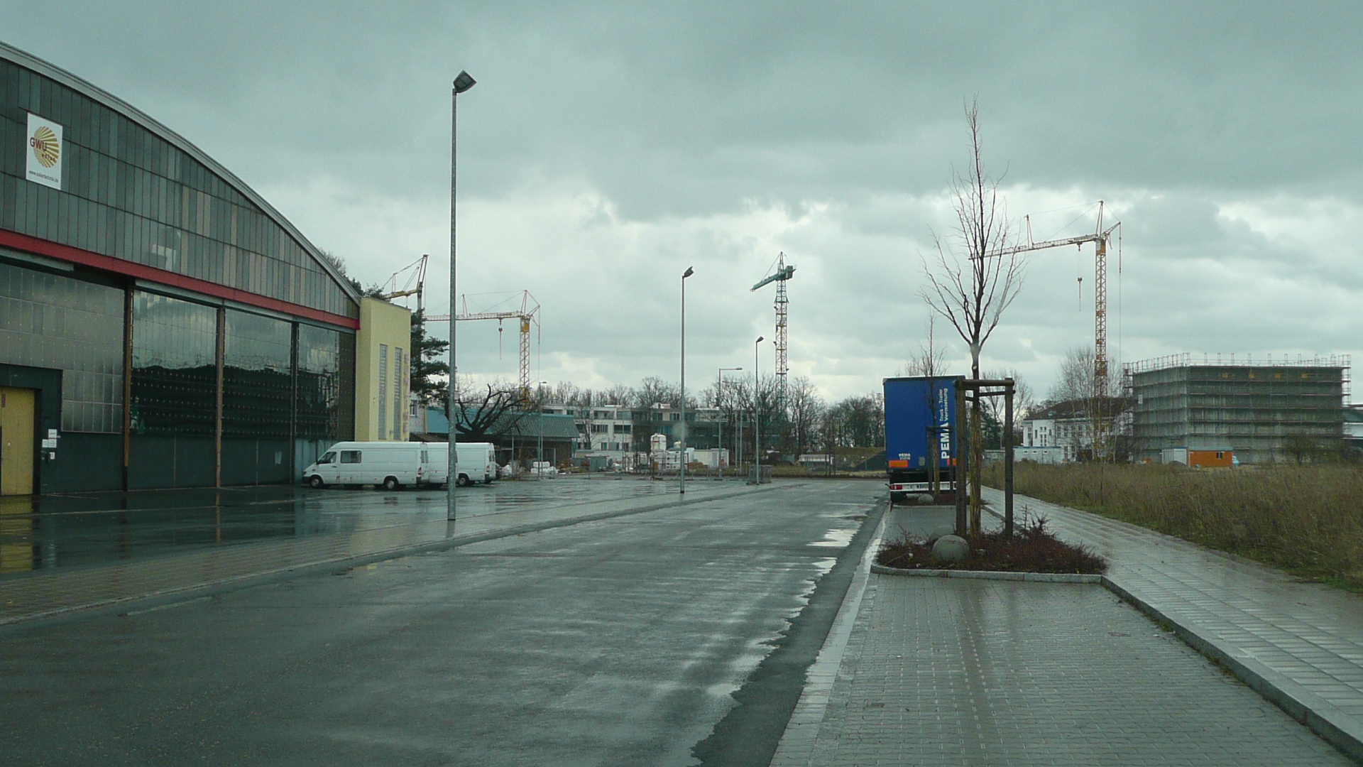 2010: südl. ehemaliger Hangar am früheren Flugplatz Fürth-Atzenhof jetzt modern umgebauter Firmensitz im Golfpark Fürth. Im Hintergrund neue Wohnhäuser, im Bau befindliche Gebäude Fraunhofer-Entwicklungszentrum Röntgentechnik und die Alte Werft von 1918
