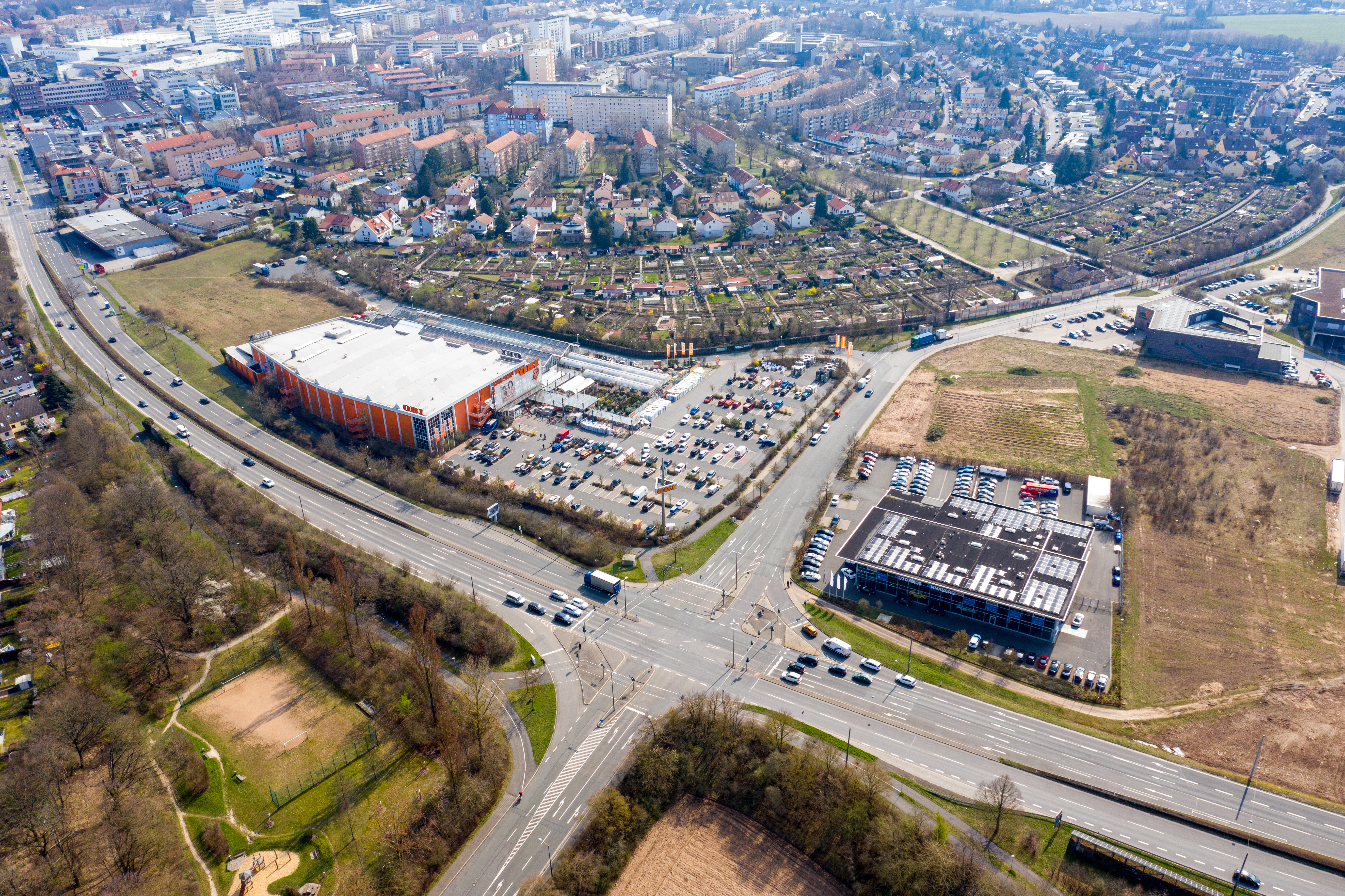 | Beschreibung | Blick über die Würzburger Straße Ecke Am Grünen Weg, links der Obi-Baumarkt, Mrz. 2020 | ||