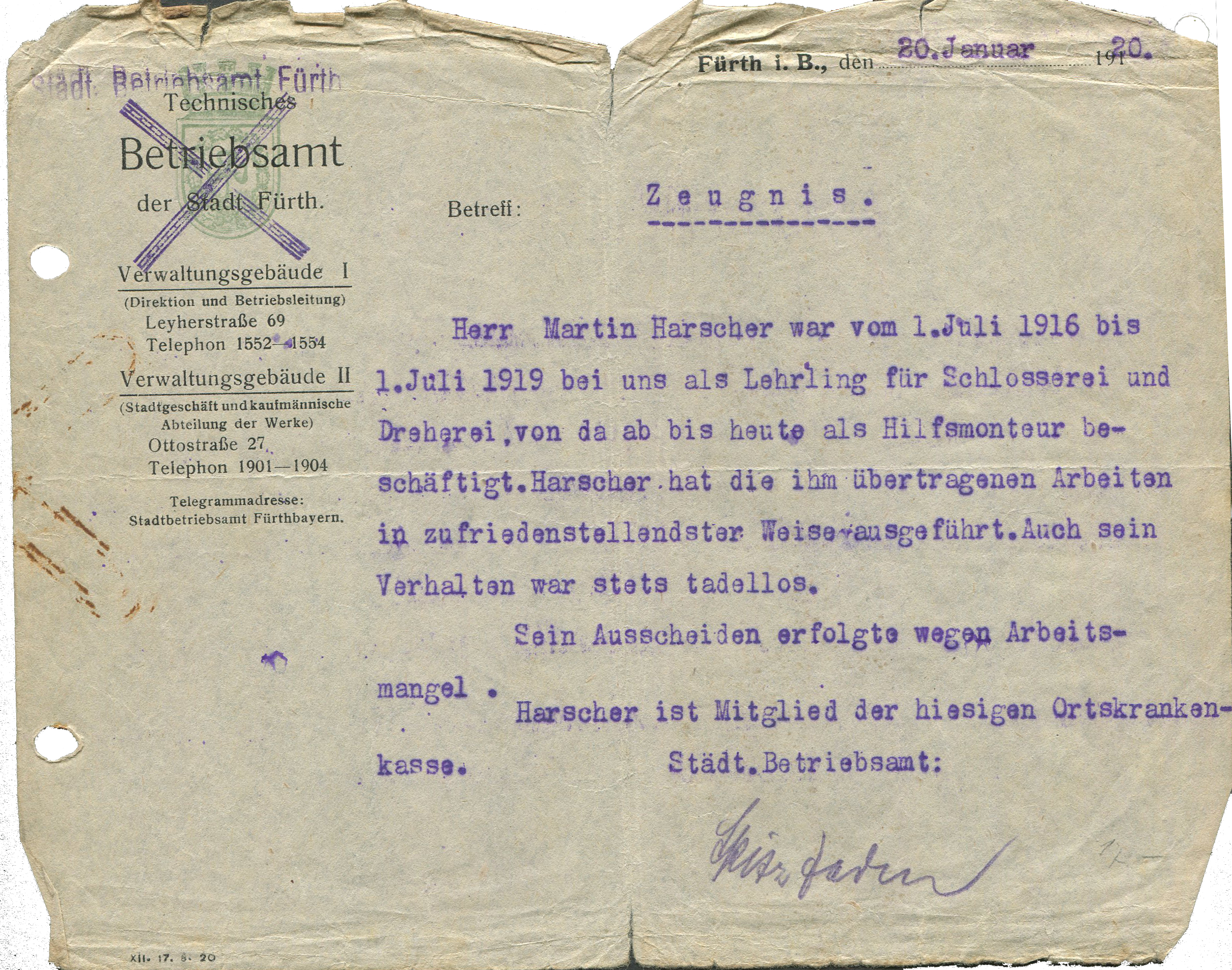 | Beschreibung | Zeugnis vom Technischen Betriebsamt der Stadt Fürth für Martin Harscher, 1920 | ||