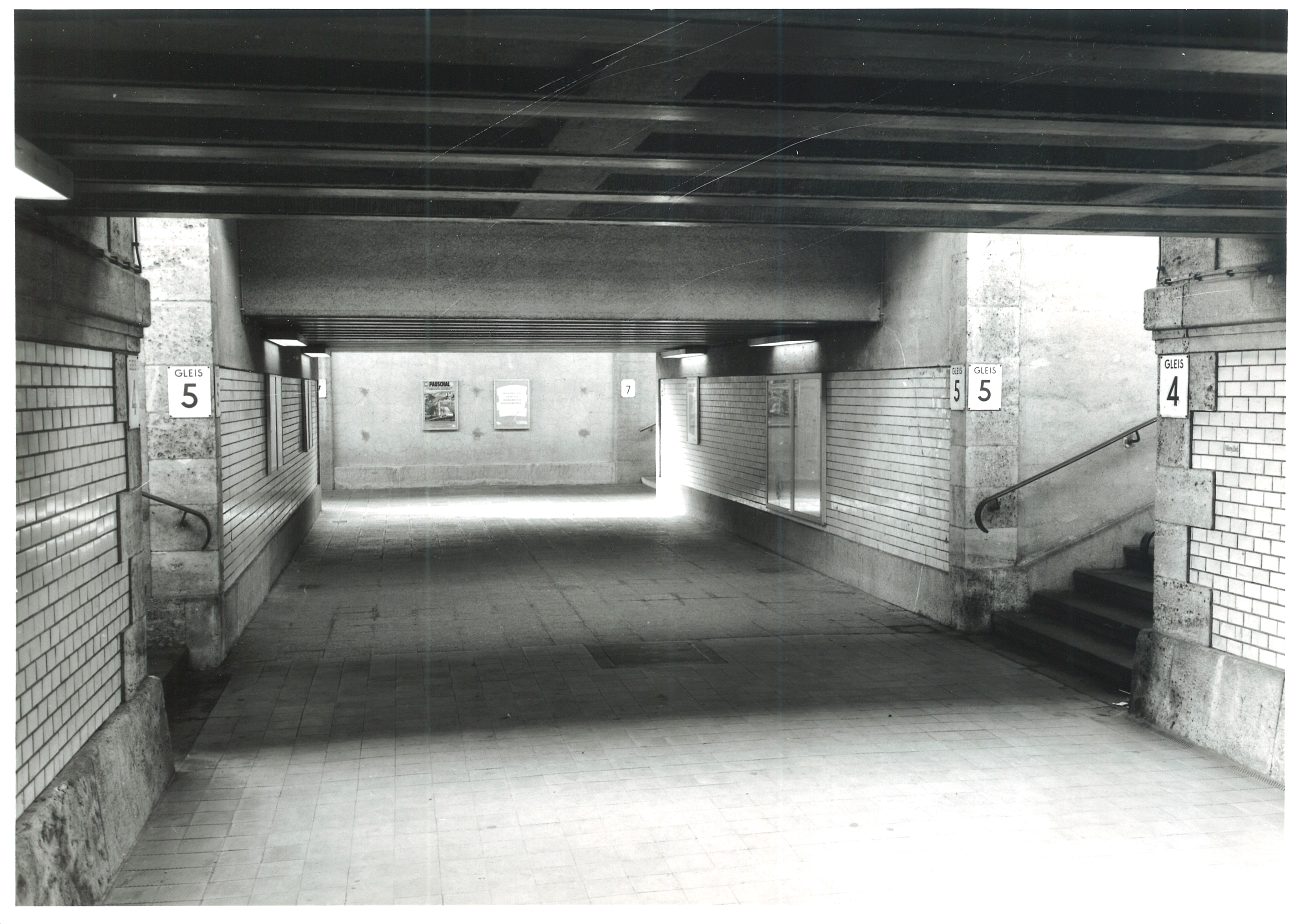 | Beschreibung | Hauptbahnhof, Bahnsteigunterführung in Blickrichtung Südstadt, 1982. Bestandsaufnahme vor Baubeginn U-Bahn | ||