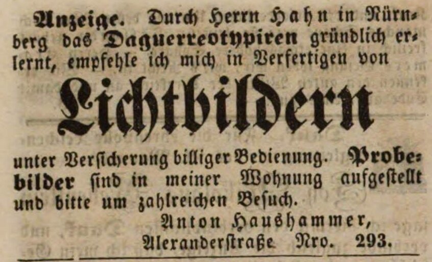 | Dateiinfo (Bild-Unterschrift und Info-Box, automatisch erstellt) | Werbeanzeige des Daguerreotypisten Anton Haushammer, Mai 1846 Erstellungsdatum: 1846<br>Lizenz: Out of copyright - non commercial re-use | ||