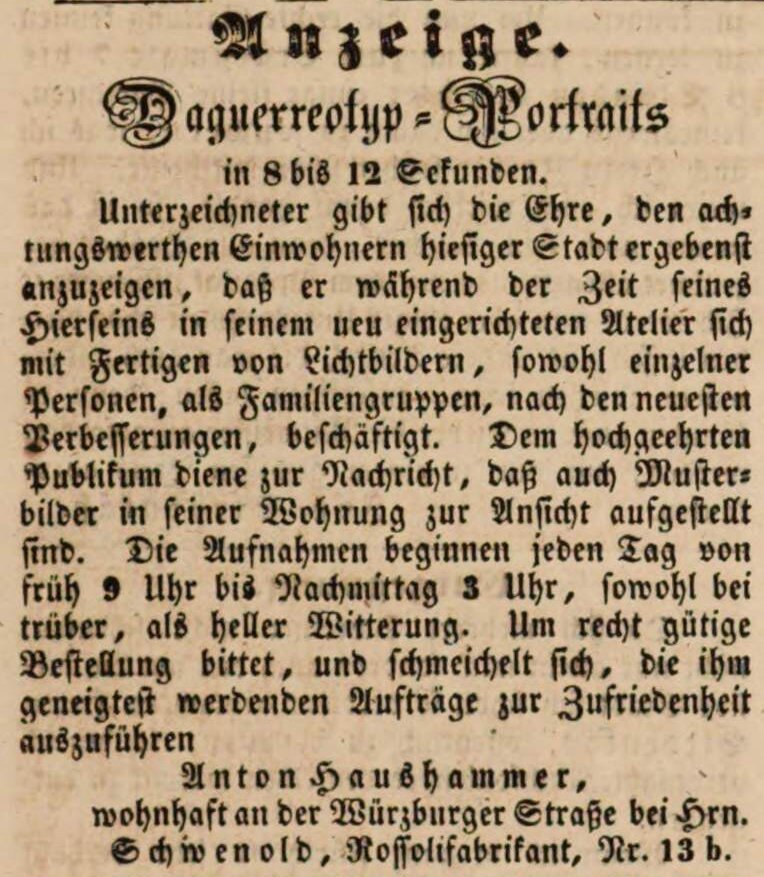| Dateiinfo (Bild-Unterschrift und Info-Box, automatisch erstellt) | Werbeanzeige des Daguerreotypisten Anton Haushammer, Februar 1850 Erstellungsdatum: 1850<br>Lizenz: Out of copyright - non commercial re-use | ||