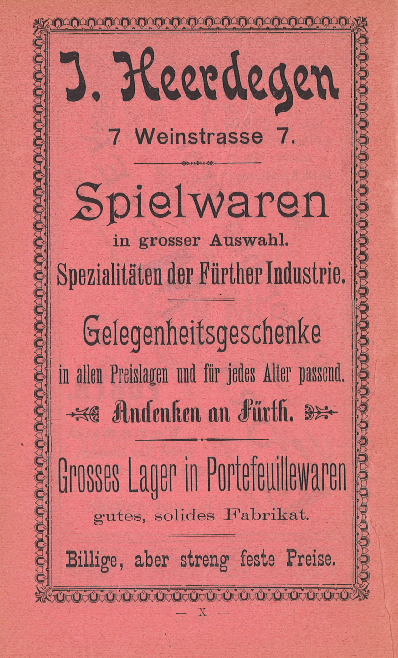 | Beschreibung | J. Heerdegen Spielwaren, ehemals Weinstraße 7, Werbeanzeige von 1898 | ||