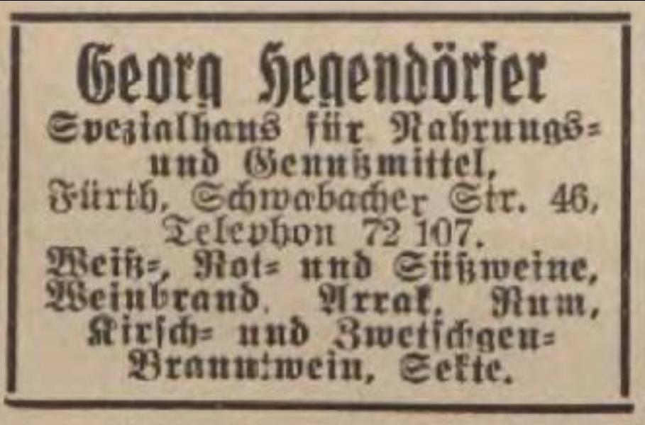| Unternehmen | Nahrungs- und Genussmittelhaus Georg Hegendörfer | ||