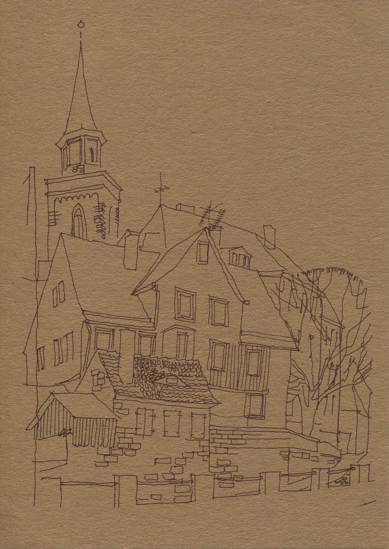BeschreibungHeiligenberg - im Hintergrund der Schrödershof und die St. Michael Kirche, Zeichung von Ernst Wilfert, ca. 1970