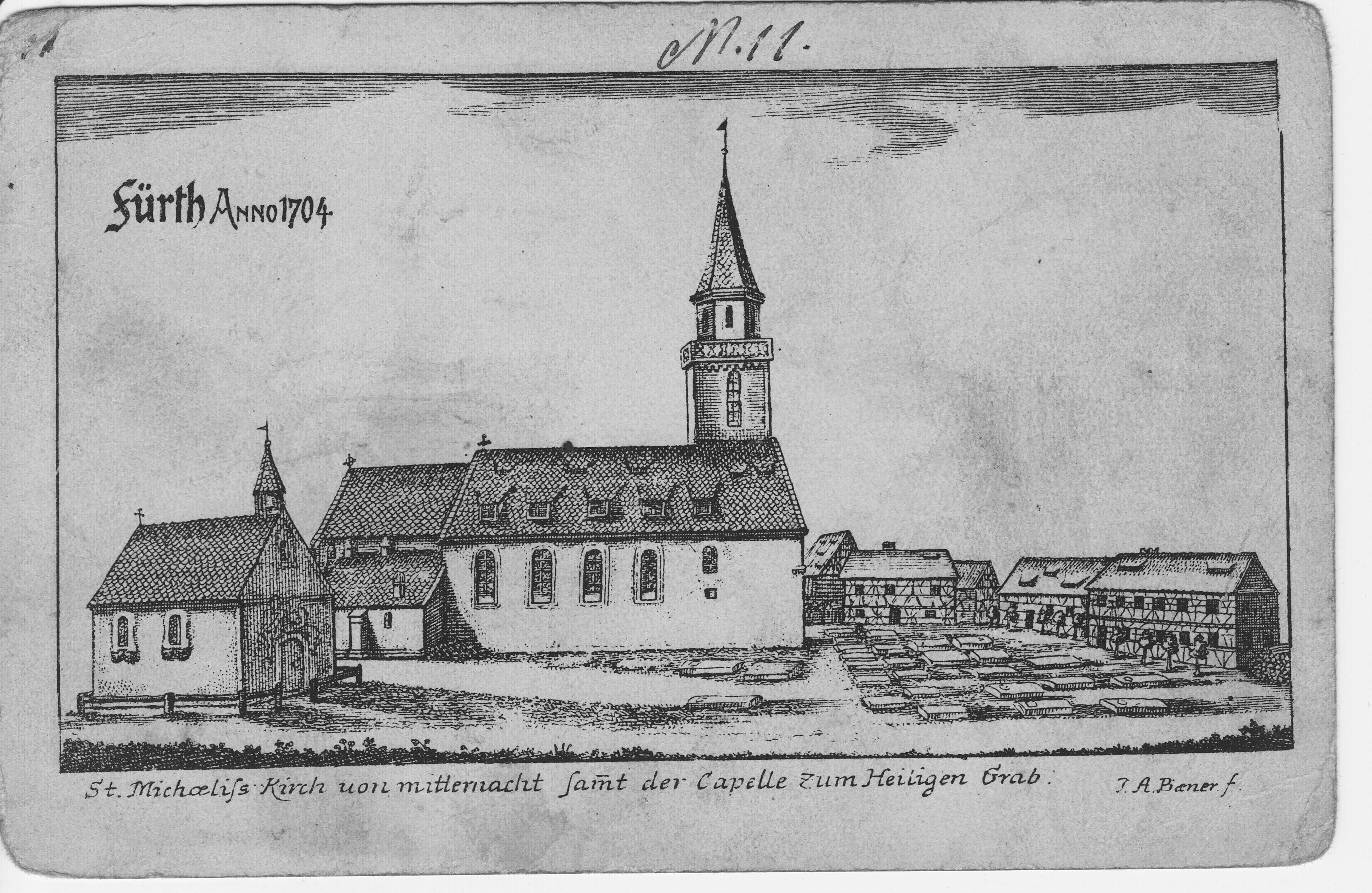 Kapelle zum Heiligen Grab, Kirche St. Michael, Postkarte, Boenerstich. Erstellungsdatum: 1704<br>Lizenz: cc-by-sa-3.0