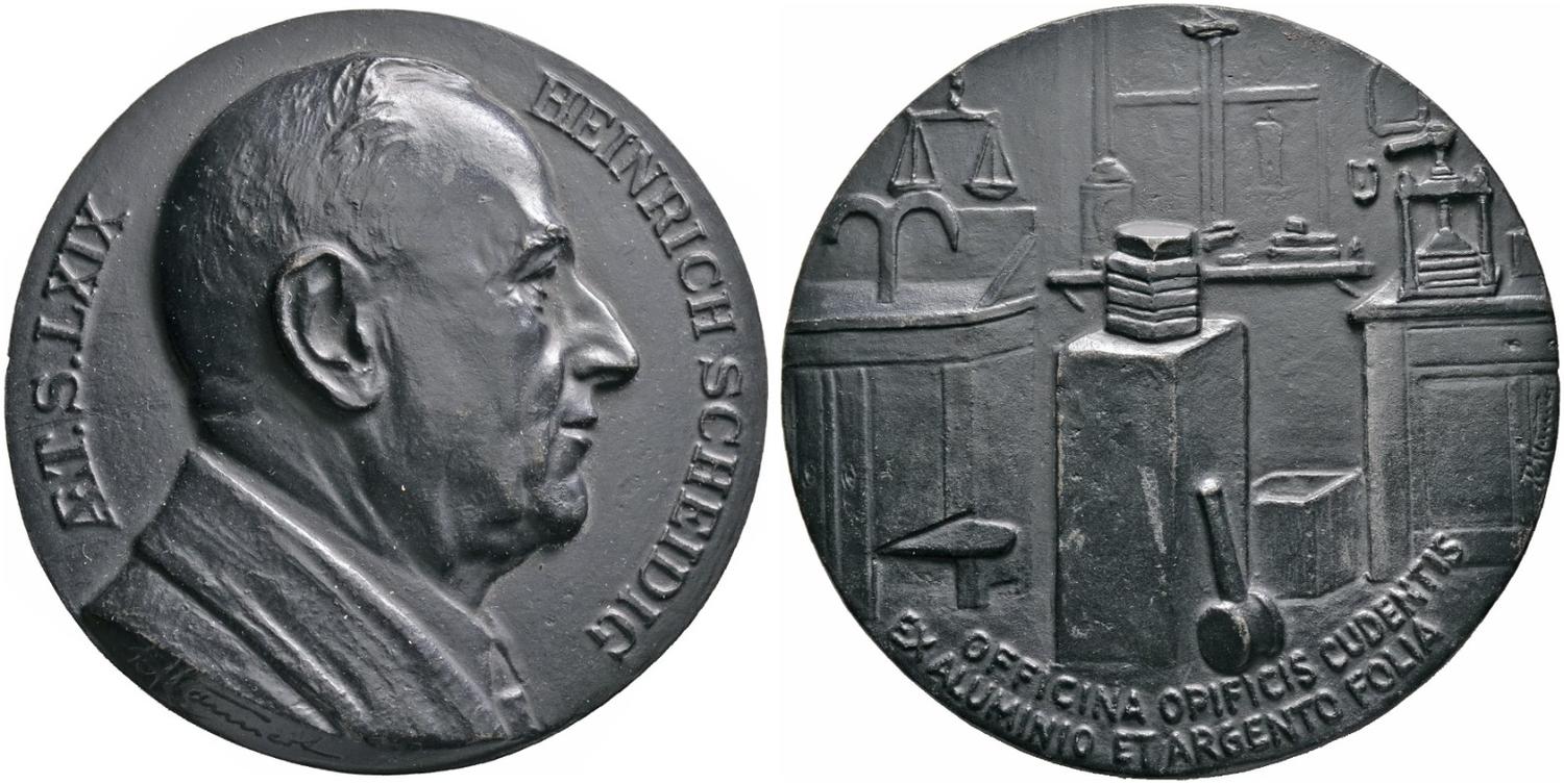 | Beschreibung | Medailleure. Konrad Mannert, Eisengussmedaille o.J. Auf den Unternehmer Heinrich Scheidig aus Fürth. Dessen Büste im Alter von 69 Jahren nach rechts / Innenansicht einer Werkstatt mit verschiedenen Gerätschaften und Werkzeugen. 97,5 mm | ||