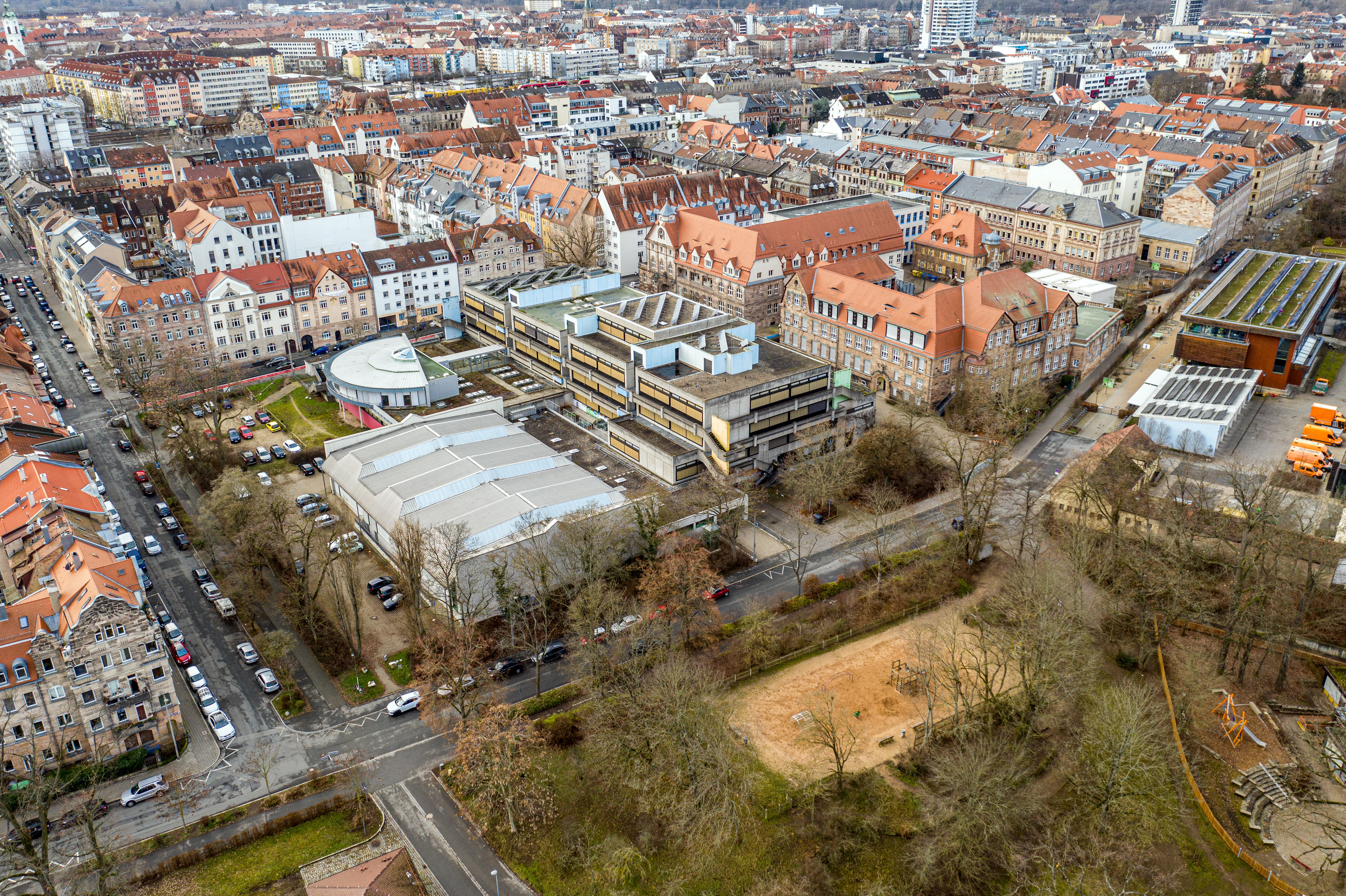| Beschreibung | Blick über die Helene-Lange-Gymnasium - im Vordergrund die Reste des Bunker Birkenstraße - heute Spielplatz Stadtpark Bunkerterrasse, Jan. 2020 | ||