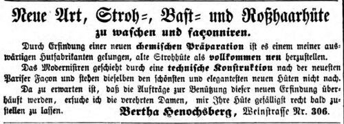| Beschreibung | Zeitungsannonce von Bertha Henochsberg, März 1857 | ||