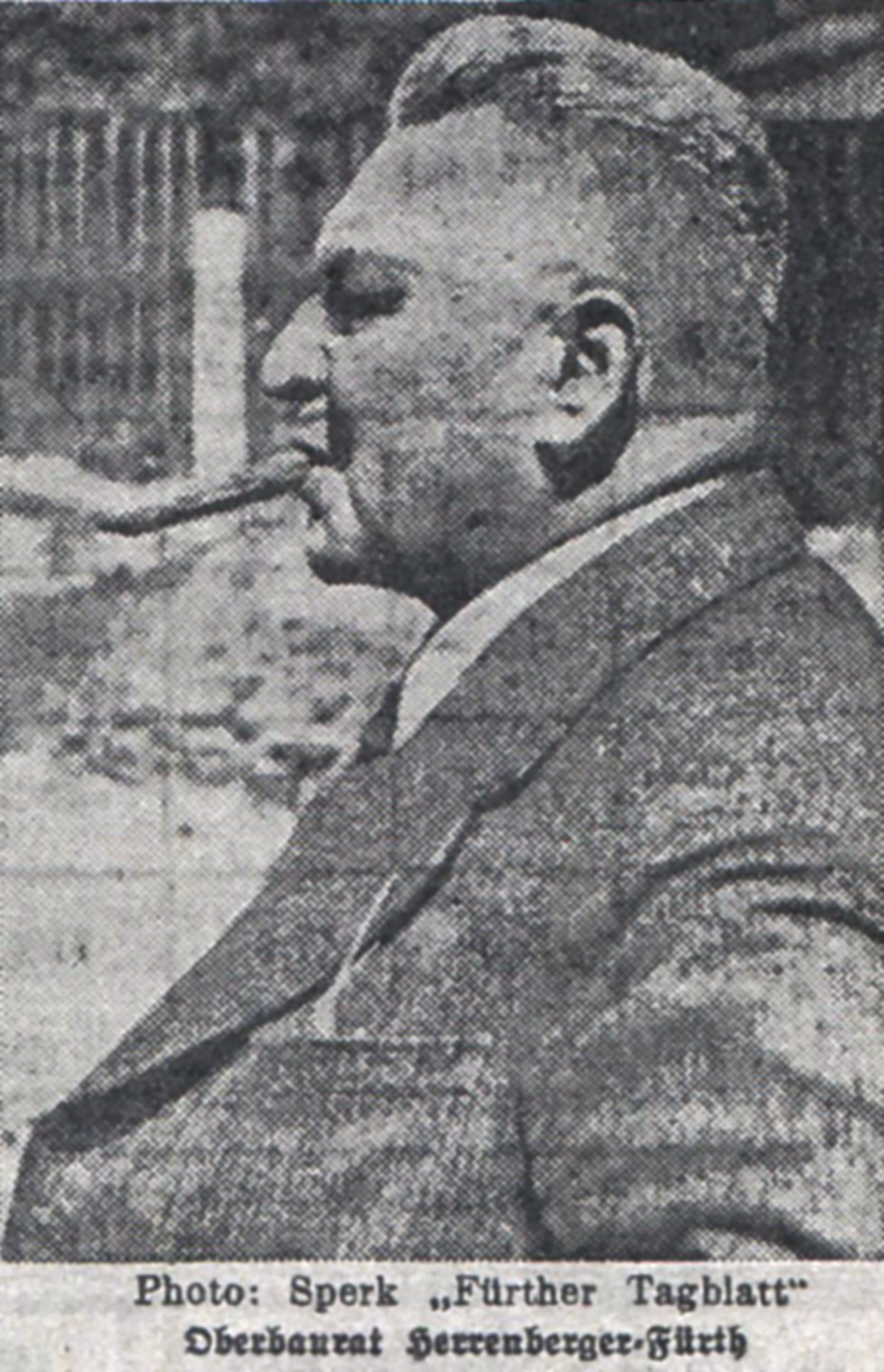 | Dateiinfo (Bild-Unterschrift und Info-Box, automatisch erstellt) | Oberbaurat Hermann Herrenberger im Profil mit Zigarre, 1935 Urheber: Sperk, Fürther Tagblatt<br>Erstellungsdatum: 1935<br>Lizenz: cc-by-sa-3.0 | ||